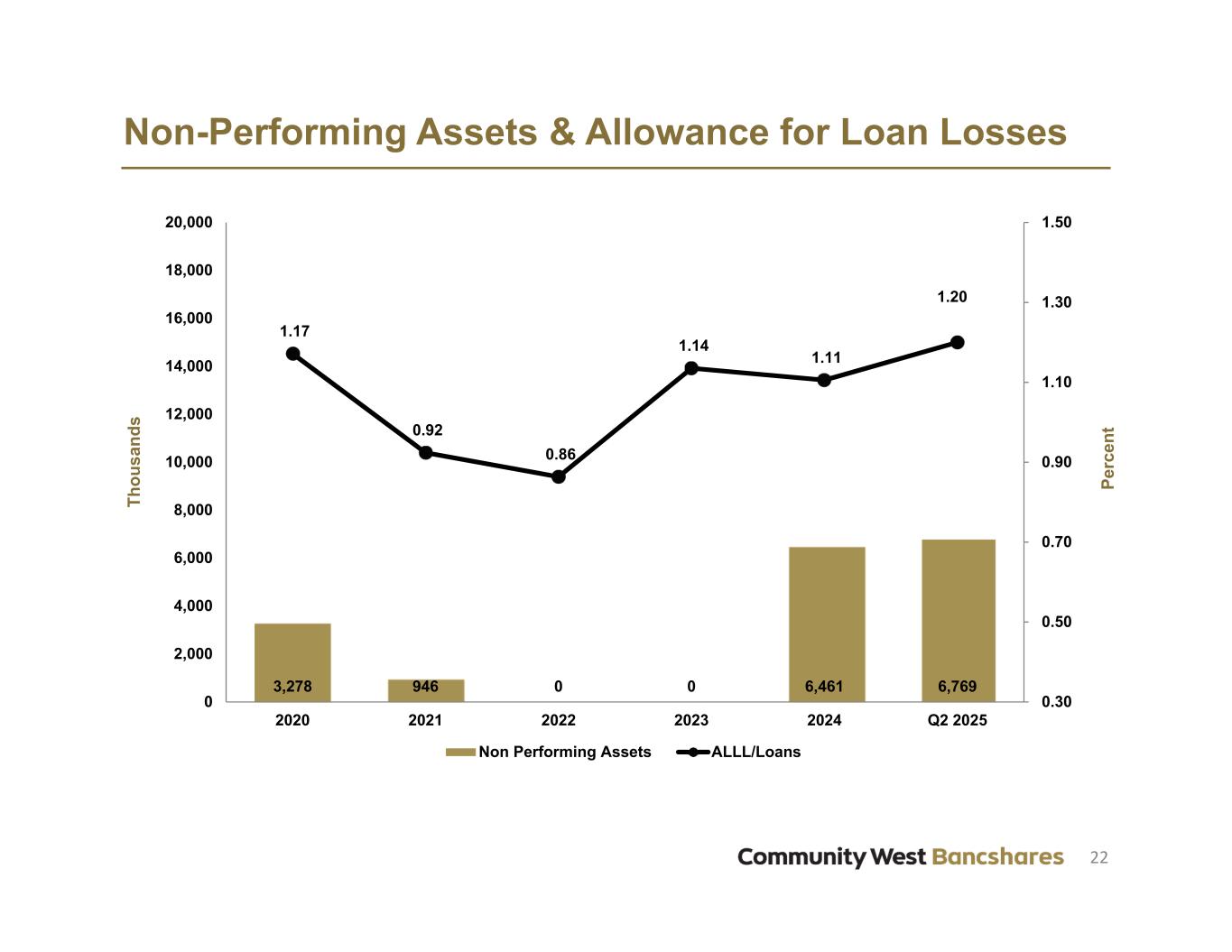 21 Average Loan Totals & Yield CAGR = 19.54% 1,053,450 1,067,316 1,133,641 1,263,226 1,978,386 2,352,261 4.94 5.07 4.93 5.53 6.58 6.70 0.00 1.00 2.00 3.00 4.00 5.00 6.00 7.00 8.00 0 500,000 1,000,000 1,500,000 2,000,000 2,500,000 2020 2021 2022 2023 2024 Q2 YTD 2025 Pe rc en t Th ou sa nd s Total Loans Loan Yield