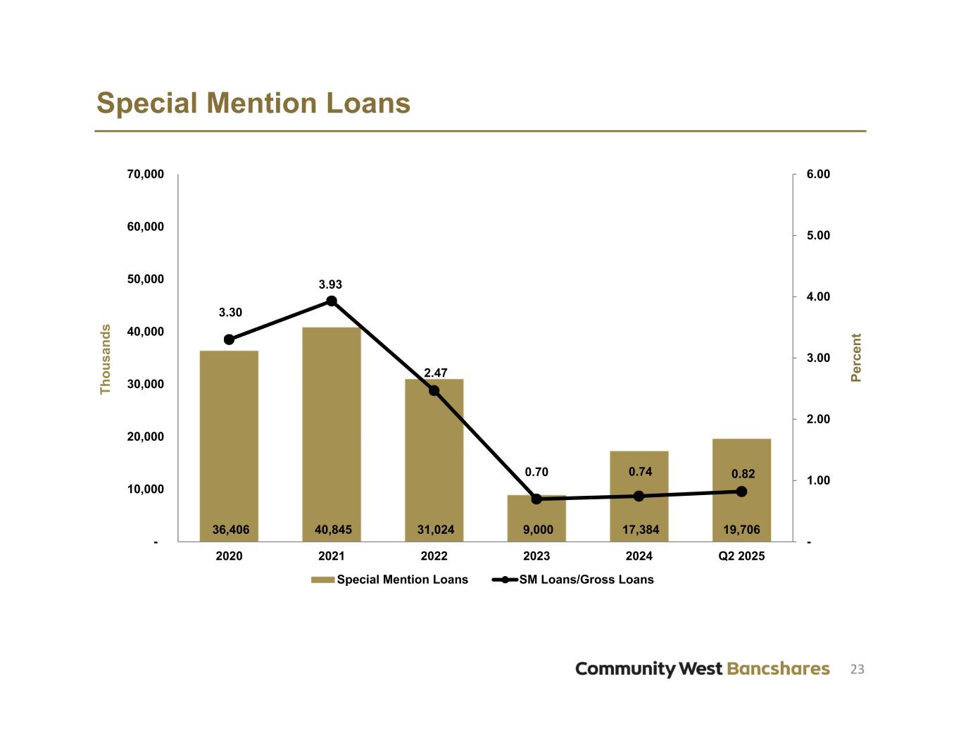 22 Non-Performing Assets & Allowance for Loan Losses 3,278 946 0 0 6,461 6,769 1.17 0.92 0.86 1.14 1.11 1.20 0.30 0.50 0.70 0.90 1.10 1.30 1.50 0 2,000 4,000 6,000 8,000 10,000 12,000 14,000 16,000 18,000 20,000 2020 2021 2022 2023 2024 Q2 2025 Pe rc en t Th ou sa nd s Non Performing Assets ALLL/Loans