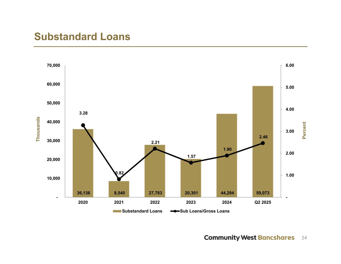 23 Special Mention Loans 36,406 40,845 31,024 9,000 17,384 19,706 3.30 3.93 2.47 0.70 0.74 0.82 - 1.00 2.00 3.00 4.00 5.00 6.00 - 10,000 20,000 30,000 40,000 50,000 60,000 70,000 2020 2021 2022 2023 2024 Q2 2025 Pe rc en t Th ou sa nd s Special Mention Loans SM Loans/Gross Loans