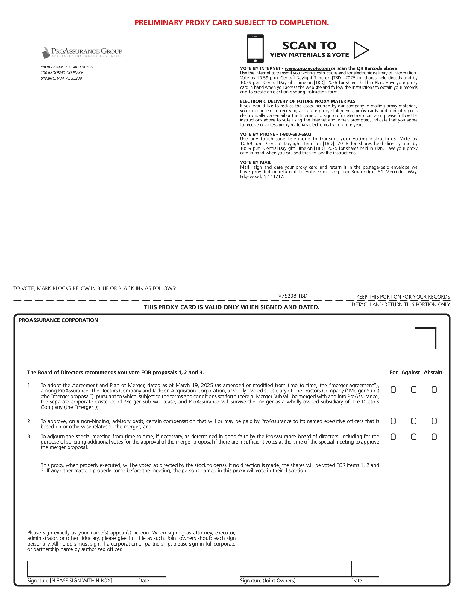 At the special meeting, ProAssurance stockholders will be asked to consider and vote on a proposal to adopt the Agreement and Plan of Merger, dated as of March 19, 2025 (as amended or modified from time to time, the “merger agreement”), among ProAssurance, The Doctors Company, and Jackson Acquisition Corporation, a wholly owned subsidiary of The Doctors Company (“Merger Sub”). Subject to the terms and conditions of the merger agreement, Merger Sub will be merged with and into ProAssurance, the separate existence of Merger Sub will cease, and ProAssurance will survive the merger as a wholly owned subsidiary of The Doctors Company (the “merger”).