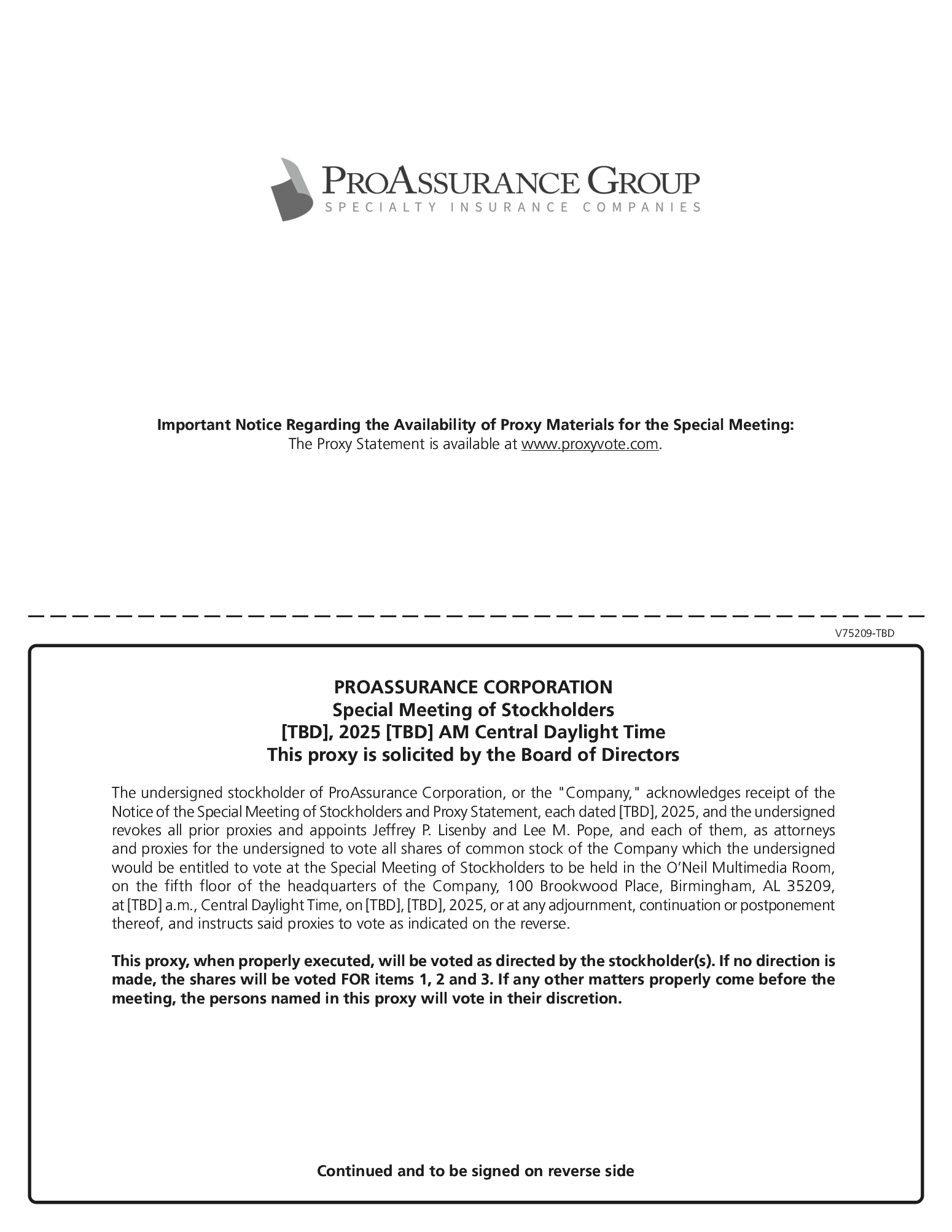 You are cordially invited to attend a special meeting of the stockholders of ProAssurance Corporation (“ProAssurance”). The special meeting will be held at [•], Central Daylight Time, on [•], 2025, in the O’Neil Multimedia Room at the headquarters of ProAssurance, located at 100 Brookwood Place, Birmingham, Alabama 35209 (the “special meeting”).