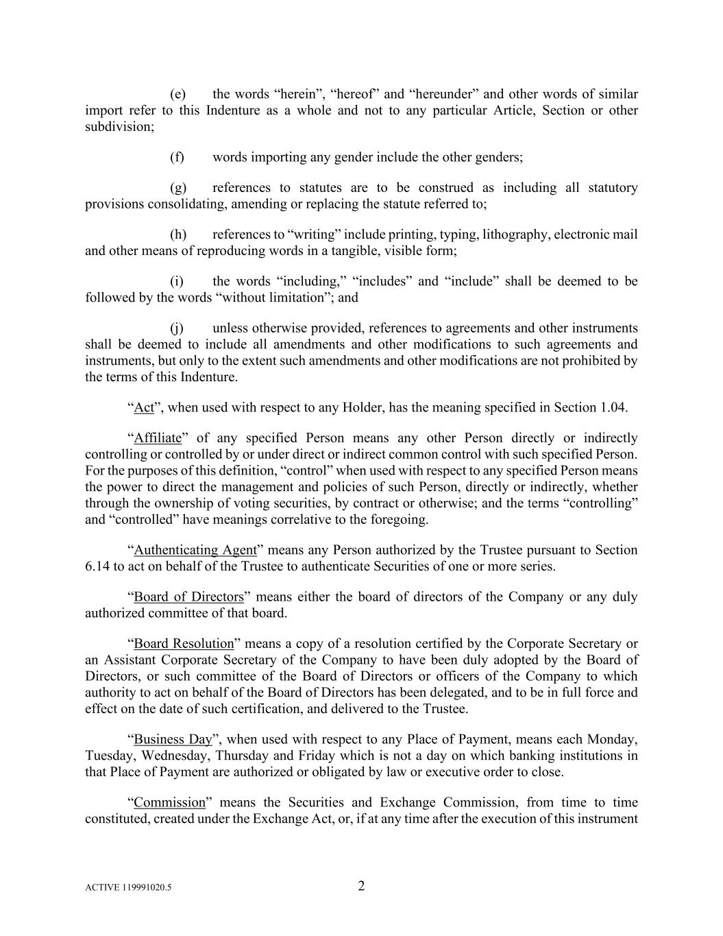 ACTIVE 119991020.5 2 (e) the words “herein”, “hereof” and “hereunder” and other words of similar import refer to this Indenture as a whole and not to any particular Article, Section or other subdivision; (f) words importing any gender include the other genders; (g) references to statutes are to be construed as including all statutory provisions consolidating, amending or replacing the statute referred to; (h) references to “writing” include printing, typing, lithography, electronic mail and other means of reproducing words in a tangible, visible form; (i) the words “including,” “includes” and “include” shall be deemed to be followed by the words “without limitation”; and (j) unless otherwise provided, references to agreements and other instruments shall be deemed to include all amendments and other modifications to such agreements and instruments, but only to the extent such amendments and other modifications are not prohibited by the terms of this Indenture. “Act”, when used with respect to any Holder, has the meaning specified in Section 1.04. “Affiliate” of any specified Person means any other Person directly or indirectly controlling or controlled by or under direct or indirect common control with such specified Person. For the purposes of this definition, “control” when used with respect to any specified Person means the power to direct the management and policies of such Person, directly or indirectly, whether through the ownership of voting securities, by contract or otherwise; and the terms “controlling” and “controlled” have meanings correlative to the foregoing. “Authenticating Agent” means any Person authorized by the Trustee pursuant to Section 6.14 to act on behalf of the Trustee to authenticate Securities of one or more series. “Board of Directors” means either the board of directors of the Company or any duly authorized committee of that board. “Board Resolution” means a copy of a resolution certified by the Corporate Secretary or an Assistant Corporate Secretary of the Company to have been duly adopted by the Board of Directors, or such committee of the Board of Directors or officers of the Company to which authority to act on behalf of the Board of Directors has been delegated, and to be in full force and effect on the date of such certification, and delivered to the Trustee. “Business Day”, when used with respect to any Place of Payment, means each Monday, Tuesday, Wednesday, Thursday and Friday which is not a day on which banking institutions in that Place of Payment are authorized or obligated by law or executive order to close. “Commission” means the Securities and Exchange Commission, from time to time constituted, created under the Exchange Act, or, if at any time after the execution of this instrument