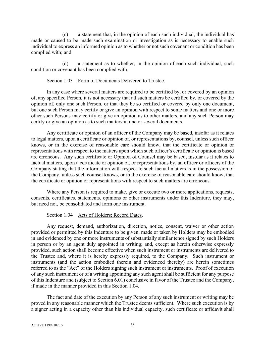 ACTIVE 119991020.5 9 (c) a statement that, in the opinion of each such individual, the individual has made or caused to be made such examination or investigation as is necessary to enable such individual to express an informed opinion as to whether or not such covenant or condition has been complied with; and (d) a statement as to whether, in the opinion of each such individual, such condition or covenant has been complied with. Section 1.03 Form of Documents Delivered to Trustee. In any case where several matters are required to be certified by, or covered by an opinion of, any specified Person, it is not necessary that all such matters be certified by, or covered by the opinion of, only one such Person, or that they be so certified or covered by only one document, but one such Person may certify or give an opinion with respect to some matters and one or more other such Persons may certify or give an opinion as to other matters, and any such Person may certify or give an opinion as to such matters in one or several documents. Any certificate or opinion of an officer of the Company may be based, insofar as it relates to legal matters, upon a certificate or opinion of, or representations by, counsel, unless such officer knows, or in the exercise of reasonable care should know, that the certificate or opinion or representations with respect to the matters upon which such officer’s certificate or opinion is based are erroneous. Any such certificate or Opinion of Counsel may be based, insofar as it relates to factual matters, upon a certificate or opinion of, or representations by, an officer or officers of the Company stating that the information with respect to such factual matters is in the possession of the Company, unless such counsel knows, or in the exercise of reasonable care should know, that the certificate or opinion or representations with respect to such matters are erroneous. Where any Person is required to make, give or execute two or more applications, requests, consents, certificates, statements, opinions or other instruments under this Indenture, they may, but need not, be consolidated and form one instrument. Section 1.04 Acts of Holders; Record Dates. Any request, demand, authorization, direction, notice, consent, waiver or other action provided or permitted by this Indenture to be given, made or taken by Holders may be embodied in and evidenced by one or more instruments of substantially similar tenor signed by such Holders in person or by an agent duly appointed in writing; and, except as herein otherwise expressly provided, such action shall become effective when such instrument or instruments are delivered to the Trustee and, where it is hereby expressly required, to the Company. Such instrument or instruments (and the action embodied therein and evidenced thereby) are herein sometimes referred to as the “Act” of the Holders signing such instrument or instruments. Proof of execution of any such instrument or of a writing appointing any such agent shall be sufficient for any purpose of this Indenture and (subject to Section 6.01) conclusive in favor of the Trustee and the Company, if made in the manner provided in this Section 1.04. The fact and date of the execution by any Person of any such instrument or writing may be proved in any reasonable manner which the Trustee deems sufficient. Where such execution is by a signer acting in a capacity other than his individual capacity, such certificate or affidavit shall