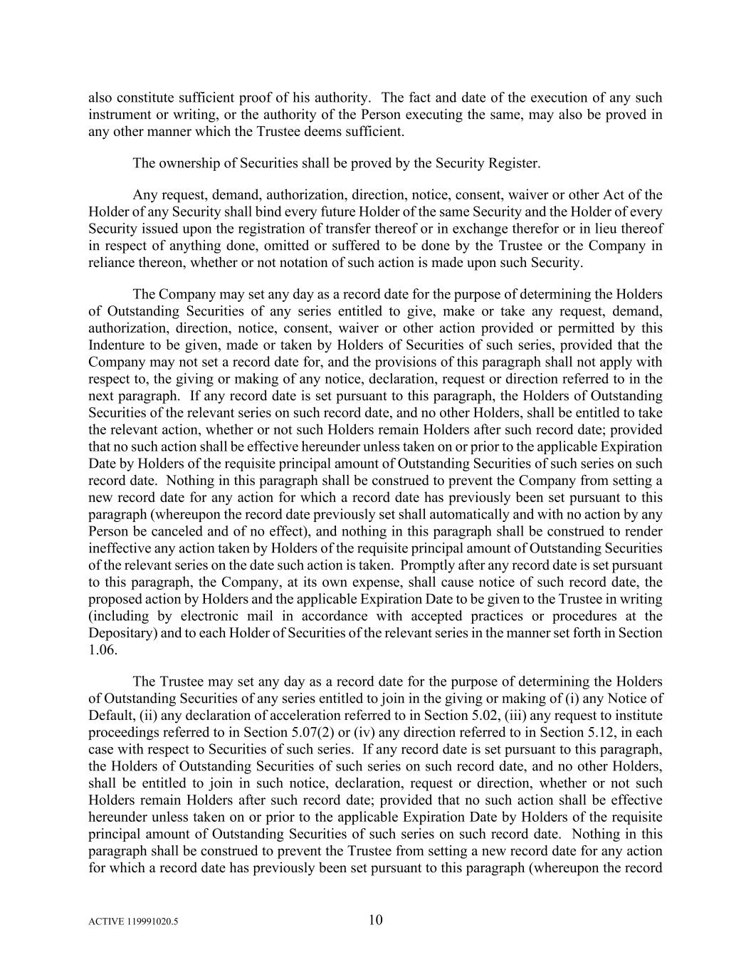 ACTIVE 119991020.5 10 also constitute sufficient proof of his authority. The fact and date of the execution of any such instrument or writing, or the authority of the Person executing the same, may also be proved in any other manner which the Trustee deems sufficient. The ownership of Securities shall be proved by the Security Register. Any request, demand, authorization, direction, notice, consent, waiver or other Act of the Holder of any Security shall bind every future Holder of the same Security and the Holder of every Security issued upon the registration of transfer thereof or in exchange therefor or in lieu thereof in respect of anything done, omitted or suffered to be done by the Trustee or the Company in reliance thereon, whether or not notation of such action is made upon such Security. The Company may set any day as a record date for the purpose of determining the Holders of Outstanding Securities of any series entitled to give, make or take any request, demand, authorization, direction, notice, consent, waiver or other action provided or permitted by this Indenture to be given, made or taken by Holders of Securities of such series, provided that the Company may not set a record date for, and the provisions of this paragraph shall not apply with respect to, the giving or making of any notice, declaration, request or direction referred to in the next paragraph. If any record date is set pursuant to this paragraph, the Holders of Outstanding Securities of the relevant series on such record date, and no other Holders, shall be entitled to take the relevant action, whether or not such Holders remain Holders after such record date; provided that no such action shall be effective hereunder unless taken on or prior to the applicable Expiration Date by Holders of the requisite principal amount of Outstanding Securities of such series on such record date. Nothing in this paragraph shall be construed to prevent the Company from setting a new record date for any action for which a record date has previously been set pursuant to this paragraph (whereupon the record date previously set shall automatically and with no action by any Person be canceled and of no effect), and nothing in this paragraph shall be construed to render ineffective any action taken by Holders of the requisite principal amount of Outstanding Securities of the relevant series on the date such action is taken. Promptly after any record date is set pursuant to this paragraph, the Company, at its own expense, shall cause notice of such record date, the proposed action by Holders and the applicable Expiration Date to be given to the Trustee in writing (including by electronic mail in accordance with accepted practices or procedures at the Depositary) and to each Holder of Securities of the relevant series in the manner set forth in Section 1.06. The Trustee may set any day as a record date for the purpose of determining the Holders of Outstanding Securities of any series entitled to join in the giving or making of (i) any Notice of Default, (ii) any declaration of acceleration referred to in Section 5.02, (iii) any request to institute proceedings referred to in Section 5.07(2) or (iv) any direction referred to in Section 5.12, in each case with respect to Securities of such series. If any record date is set pursuant to this paragraph, the Holders of Outstanding Securities of such series on such record date, and no other Holders, shall be entitled to join in such notice, declaration, request or direction, whether or not such Holders remain Holders after such record date; provided that no such action shall be effective hereunder unless taken on or prior to the applicable Expiration Date by Holders of the requisite principal amount of Outstanding Securities of such series on such record date. Nothing in this paragraph shall be construed to prevent the Trustee from setting a new record date for any action for which a record date has previously been set pursuant to this paragraph (whereupon the record