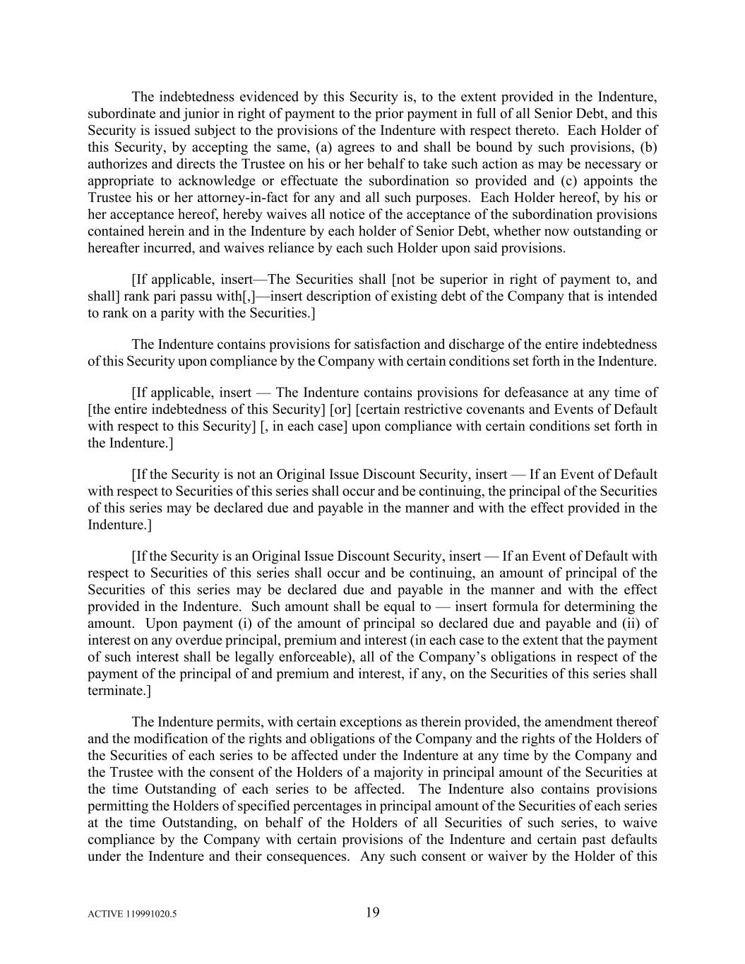 ACTIVE 119991020.5 19 The indebtedness evidenced by this Security is, to the extent provided in the Indenture, subordinate and junior in right of payment to the prior payment in full of all Senior Debt, and this Security is issued subject to the provisions of the Indenture with respect thereto. Each Holder of this Security, by accepting the same, (a) agrees to and shall be bound by such provisions, (b) authorizes and directs the Trustee on his or her behalf to take such action as may be necessary or appropriate to acknowledge or effectuate the subordination so provided and (c) appoints the Trustee his or her attorney-in-fact for any and all such purposes. Each Holder hereof, by his or her acceptance hereof, hereby waives all notice of the acceptance of the subordination provisions contained herein and in the Indenture by each holder of Senior Debt, whether now outstanding or hereafter incurred, and waives reliance by each such Holder upon said provisions. [If applicable, insert—The Securities shall [not be superior in right of payment to, and shall] rank pari passu with[,]—insert description of existing debt of the Company that is intended to rank on a parity with the Securities.] The Indenture contains provisions for satisfaction and discharge of the entire indebtedness of this Security upon compliance by the Company with certain conditions set forth in the Indenture. [If applicable, insert — The Indenture contains provisions for defeasance at any time of [the entire indebtedness of this Security] [or] [certain restrictive covenants and Events of Default with respect to this Security] [, in each case] upon compliance with certain conditions set forth in the Indenture.] [If the Security is not an Original Issue Discount Security, insert — If an Event of Default with respect to Securities of this series shall occur and be continuing, the principal of the Securities of this series may be declared due and payable in the manner and with the effect provided in the Indenture.] [If the Security is an Original Issue Discount Security, insert — If an Event of Default with respect to Securities of this series shall occur and be continuing, an amount of principal of the Securities of this series may be declared due and payable in the manner and with the effect provided in the Indenture. Such amount shall be equal to — insert formula for determining the amount. Upon payment (i) of the amount of principal so declared due and payable and (ii) of interest on any overdue principal, premium and interest (in each case to the extent that the payment of such interest shall be legally enforceable), all of the Company’s obligations in respect of the payment of the principal of and premium and interest, if any, on the Securities of this series shall terminate.] The Indenture permits, with certain exceptions as therein provided, the amendment thereof and the modification of the rights and obligations of the Company and the rights of the Holders of the Securities of each series to be affected under the Indenture at any time by the Company and the Trustee with the consent of the Holders of a majority in principal amount of the Securities at the time Outstanding of each series to be affected. The Indenture also contains provisions permitting the Holders of specified percentages in principal amount of the Securities of each series at the time Outstanding, on behalf of the Holders of all Securities of such series, to waive compliance by the Company with certain provisions of the Indenture and certain past defaults under the Indenture and their consequences. Any such consent or waiver by the Holder of this