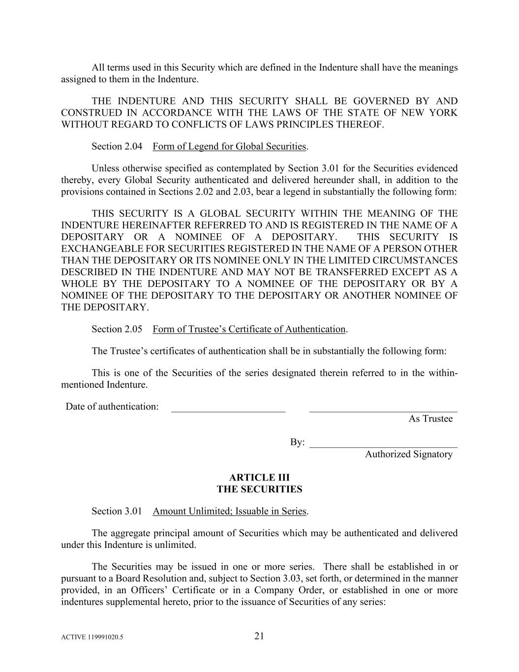ACTIVE 119991020.5 21 All terms used in this Security which are defined in the Indenture shall have the meanings assigned to them in the Indenture. THE INDENTURE AND THIS SECURITY SHALL BE GOVERNED BY AND CONSTRUED IN ACCORDANCE WITH THE LAWS OF THE STATE OF NEW YORK WITHOUT REGARD TO CONFLICTS OF LAWS PRINCIPLES THEREOF. Section 2.04 Form of Legend for Global Securities. Unless otherwise specified as contemplated by Section 3.01 for the Securities evidenced thereby, every Global Security authenticated and delivered hereunder shall, in addition to the provisions contained in Sections 2.02 and 2.03, bear a legend in substantially the following form: THIS SECURITY IS A GLOBAL SECURITY WITHIN THE MEANING OF THE INDENTURE HEREINAFTER REFERRED TO AND IS REGISTERED IN THE NAME OF A DEPOSITARY OR A NOMINEE OF A DEPOSITARY. THIS SECURITY IS EXCHANGEABLE FOR SECURITIES REGISTERED IN THE NAME OF A PERSON OTHER THAN THE DEPOSITARY OR ITS NOMINEE ONLY IN THE LIMITED CIRCUMSTANCES DESCRIBED IN THE INDENTURE AND MAY NOT BE TRANSFERRED EXCEPT AS A WHOLE BY THE DEPOSITARY TO A NOMINEE OF THE DEPOSITARY OR BY A NOMINEE OF THE DEPOSITARY TO THE DEPOSITARY OR ANOTHER NOMINEE OF THE DEPOSITARY. Section 2.05 Form of Trustee’s Certificate of Authentication. The Trustee’s certificates of authentication shall be in substantially the following form: This is one of the Securities of the series designated therein referred to in the within- mentioned Indenture. Date of authentication: As Trustee By: Authorized Signatory ARTICLE III THE SECURITIES Section 3.01 Amount Unlimited; Issuable in Series. The aggregate principal amount of Securities which may be authenticated and delivered under this Indenture is unlimited. The Securities may be issued in one or more series. There shall be established in or pursuant to a Board Resolution and, subject to Section 3.03, set forth, or determined in the manner provided, in an Officers’ Certificate or in a Company Order, or established in one or more indentures supplemental hereto, prior to the issuance of Securities of any series: