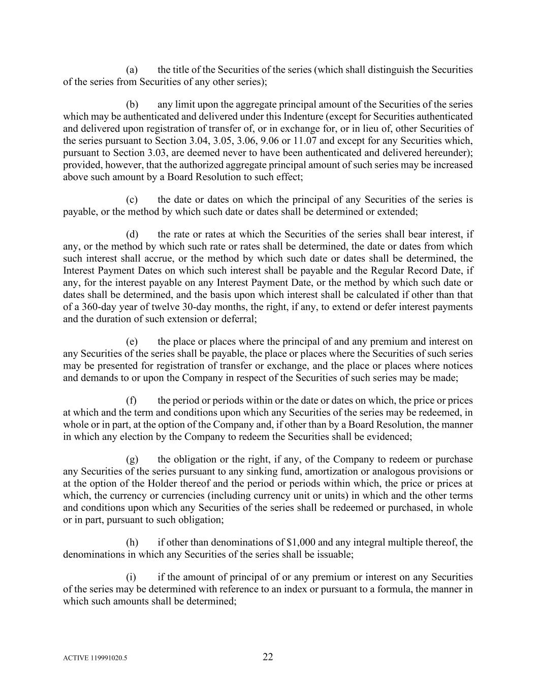 ACTIVE 119991020.5 22 (a) the title of the Securities of the series (which shall distinguish the Securities of the series from Securities of any other series); (b) any limit upon the aggregate principal amount of the Securities of the series which may be authenticated and delivered under this Indenture (except for Securities authenticated and delivered upon registration of transfer of, or in exchange for, or in lieu of, other Securities of the series pursuant to Section 3.04, 3.05, 3.06, 9.06 or 11.07 and except for any Securities which, pursuant to Section 3.03, are deemed never to have been authenticated and delivered hereunder); provided, however, that the authorized aggregate principal amount of such series may be increased above such amount by a Board Resolution to such effect; (c) the date or dates on which the principal of any Securities of the series is payable, or the method by which such date or dates shall be determined or extended; (d) the rate or rates at which the Securities of the series shall bear interest, if any, or the method by which such rate or rates shall be determined, the date or dates from which such interest shall accrue, or the method by which such date or dates shall be determined, the Interest Payment Dates on which such interest shall be payable and the Regular Record Date, if any, for the interest payable on any Interest Payment Date, or the method by which such date or dates shall be determined, and the basis upon which interest shall be calculated if other than that of a 360-day year of twelve 30-day months, the right, if any, to extend or defer interest payments and the duration of such extension or deferral; (e) the place or places where the principal of and any premium and interest on any Securities of the series shall be payable, the place or places where the Securities of such series may be presented for registration of transfer or exchange, and the place or places where notices and demands to or upon the Company in respect of the Securities of such series may be made; (f) the period or periods within or the date or dates on which, the price or prices at which and the term and conditions upon which any Securities of the series may be redeemed, in whole or in part, at the option of the Company and, if other than by a Board Resolution, the manner in which any election by the Company to redeem the Securities shall be evidenced; (g) the obligation or the right, if any, of the Company to redeem or purchase any Securities of the series pursuant to any sinking fund, amortization or analogous provisions or at the option of the Holder thereof and the period or periods within which, the price or prices at which, the currency or currencies (including currency unit or units) in which and the other terms and conditions upon which any Securities of the series shall be redeemed or purchased, in whole or in part, pursuant to such obligation; (h) if other than denominations of $1,000 and any integral multiple thereof, the denominations in which any Securities of the series shall be issuable; (i) if the amount of principal of or any premium or interest on any Securities of the series may be determined with reference to an index or pursuant to a formula, the manner in which such amounts shall be determined;