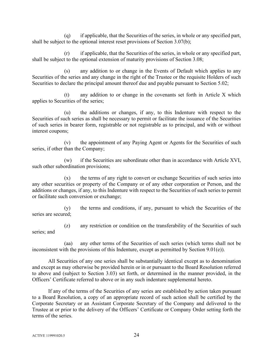 ACTIVE 119991020.5 24 (q) if applicable, that the Securities of the series, in whole or any specified part, shall be subject to the optional interest reset provisions of Section 3.07(b); (r) if applicable, that the Securities of the series, in whole or any specified part, shall be subject to the optional extension of maturity provisions of Section 3.08; (s) any addition to or change in the Events of Default which applies to any Securities of the series and any change in the right of the Trustee or the requisite Holders of such Securities to declare the principal amount thereof due and payable pursuant to Section 5.02; (t) any addition to or change in the covenants set forth in Article X which applies to Securities of the series; (u) the additions or changes, if any, to this Indenture with respect to the Securities of such series as shall be necessary to permit or facilitate the issuance of the Securities of such series in bearer form, registrable or not registrable as to principal, and with or without interest coupons; (v) the appointment of any Paying Agent or Agents for the Securities of such series, if other than the Company; (w) if the Securities are subordinate other than in accordance with Article XVI, such other subordination provisions; (x) the terms of any right to convert or exchange Securities of such series into any other securities or property of the Company or of any other corporation or Person, and the additions or changes, if any, to this Indenture with respect to the Securities of such series to permit or facilitate such conversion or exchange; (y) the terms and conditions, if any, pursuant to which the Securities of the series are secured; (z) any restriction or condition on the transferability of the Securities of such series; and (aa) any other terms of the Securities of such series (which terms shall not be inconsistent with the provisions of this Indenture, except as permitted by Section 9.01(e)). All Securities of any one series shall be substantially identical except as to denomination and except as may otherwise be provided herein or in or pursuant to the Board Resolution referred to above and (subject to Section 3.03) set forth, or determined in the manner provided, in the Officers’ Certificate referred to above or in any such indenture supplemental hereto. If any of the terms of the Securities of any series are established by action taken pursuant to a Board Resolution, a copy of an appropriate record of such action shall be certified by the Corporate Secretary or an Assistant Corporate Secretary of the Company and delivered to the Trustee at or prior to the delivery of the Officers’ Certificate or Company Order setting forth the terms of the series.