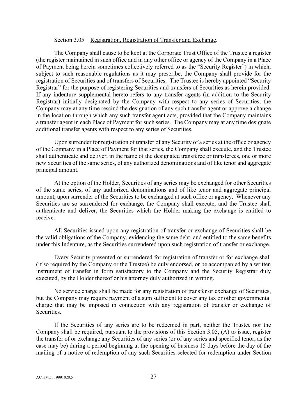 ACTIVE 119991020.5 27 Section 3.05 Registration, Registration of Transfer and Exchange. The Company shall cause to be kept at the Corporate Trust Office of the Trustee a register (the register maintained in such office and in any other office or agency of the Company in a Place of Payment being herein sometimes collectively referred to as the “Security Register”) in which, subject to such reasonable regulations as it may prescribe, the Company shall provide for the registration of Securities and of transfers of Securities. The Trustee is hereby appointed “Security Registrar” for the purpose of registering Securities and transfers of Securities as herein provided. If any indenture supplemental hereto refers to any transfer agents (in addition to the Security Registrar) initially designated by the Company with respect to any series of Securities, the Company may at any time rescind the designation of any such transfer agent or approve a change in the location through which any such transfer agent acts, provided that the Company maintains a transfer agent in each Place of Payment for such series. The Company may at any time designate additional transfer agents with respect to any series of Securities. Upon surrender for registration of transfer of any Security of a series at the office or agency of the Company in a Place of Payment for that series, the Company shall execute, and the Trustee shall authenticate and deliver, in the name of the designated transferee or transferees, one or more new Securities of the same series, of any authorized denominations and of like tenor and aggregate principal amount. At the option of the Holder, Securities of any series may be exchanged for other Securities of the same series, of any authorized denominations and of like tenor and aggregate principal amount, upon surrender of the Securities to be exchanged at such office or agency. Whenever any Securities are so surrendered for exchange, the Company shall execute, and the Trustee shall authenticate and deliver, the Securities which the Holder making the exchange is entitled to receive. All Securities issued upon any registration of transfer or exchange of Securities shall be the valid obligations of the Company, evidencing the same debt, and entitled to the same benefits under this Indenture, as the Securities surrendered upon such registration of transfer or exchange. Every Security presented or surrendered for registration of transfer or for exchange shall (if so required by the Company or the Trustee) be duly endorsed, or be accompanied by a written instrument of transfer in form satisfactory to the Company and the Security Registrar duly executed, by the Holder thereof or his attorney duly authorized in writing. No service charge shall be made for any registration of transfer or exchange of Securities, but the Company may require payment of a sum sufficient to cover any tax or other governmental charge that may be imposed in connection with any registration of transfer or exchange of Securities. If the Securities of any series are to be redeemed in part, neither the Trustee nor the Company shall be required, pursuant to the provisions of this Section 3.05, (A) to issue, register the transfer of or exchange any Securities of any series (or of any series and specified tenor, as the case may be) during a period beginning at the opening of business 15 days before the day of the mailing of a notice of redemption of any such Securities selected for redemption under Section