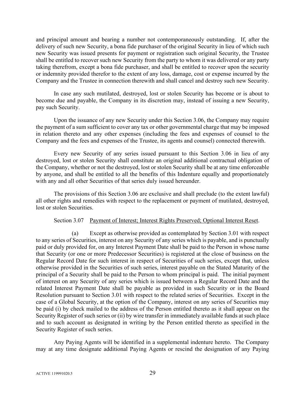 ACTIVE 119991020.5 29 and principal amount and bearing a number not contemporaneously outstanding. If, after the delivery of such new Security, a bona fide purchaser of the original Security in lieu of which such new Security was issued presents for payment or registration such original Security, the Trustee shall be entitled to recover such new Security from the party to whom it was delivered or any party taking therefrom, except a bona fide purchaser, and shall be entitled to recover upon the security or indemnity provided therefor to the extent of any loss, damage, cost or expense incurred by the Company and the Trustee in connection therewith and shall cancel and destroy such new Security. In case any such mutilated, destroyed, lost or stolen Security has become or is about to become due and payable, the Company in its discretion may, instead of issuing a new Security, pay such Security. Upon the issuance of any new Security under this Section 3.06, the Company may require the payment of a sum sufficient to cover any tax or other governmental charge that may be imposed in relation thereto and any other expenses (including the fees and expenses of counsel to the Company and the fees and expenses of the Trustee, its agents and counsel) connected therewith. Every new Security of any series issued pursuant to this Section 3.06 in lieu of any destroyed, lost or stolen Security shall constitute an original additional contractual obligation of the Company, whether or not the destroyed, lost or stolen Security shall be at any time enforceable by anyone, and shall be entitled to all the benefits of this Indenture equally and proportionately with any and all other Securities of that series duly issued hereunder. The provisions of this Section 3.06 are exclusive and shall preclude (to the extent lawful) all other rights and remedies with respect to the replacement or payment of mutilated, destroyed, lost or stolen Securities. Section 3.07 Payment of Interest; Interest Rights Preserved; Optional Interest Reset. (a) Except as otherwise provided as contemplated by Section 3.01 with respect to any series of Securities, interest on any Security of any series which is payable, and is punctually paid or duly provided for, on any Interest Payment Date shall be paid to the Person in whose name that Security (or one or more Predecessor Securities) is registered at the close of business on the Regular Record Date for such interest in respect of Securities of such series, except that, unless otherwise provided in the Securities of such series, interest payable on the Stated Maturity of the principal of a Security shall be paid to the Person to whom principal is paid. The initial payment of interest on any Security of any series which is issued between a Regular Record Date and the related Interest Payment Date shall be payable as provided in such Security or in the Board Resolution pursuant to Section 3.01 with respect to the related series of Securities. Except in the case of a Global Security, at the option of the Company, interest on any series of Securities may be paid (i) by check mailed to the address of the Person entitled thereto as it shall appear on the Security Register of such series or (ii) by wire transfer in immediately available funds at such place and to such account as designated in writing by the Person entitled thereto as specified in the Security Register of such series. Any Paying Agents will be identified in a supplemental indenture hereto. The Company may at any time designate additional Paying Agents or rescind the designation of any Paying