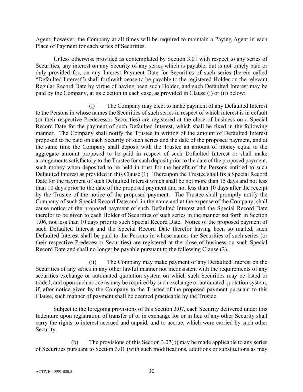 ACTIVE 119991020.5 30 Agent; however, the Company at all times will be required to maintain a Paying Agent in each Place of Payment for each series of Securities. Unless otherwise provided as contemplated by Section 3.01 with respect to any series of Securities, any interest on any Security of any series which is payable, but is not timely paid or duly provided for, on any Interest Payment Date for Securities of such series (herein called “Defaulted Interest”) shall forthwith cease to be payable to the registered Holder on the relevant Regular Record Date by virtue of having been such Holder, and such Defaulted Interest may be paid by the Company, at its election in each case, as provided in Clause (i) or (ii) below: (i) The Company may elect to make payment of any Defaulted Interest to the Persons in whose names the Securities of such series in respect of which interest is in default (or their respective Predecessor Securities) are registered at the close of business on a Special Record Date for the payment of such Defaulted Interest, which shall be fixed in the following manner. The Company shall notify the Trustee in writing of the amount of Defaulted Interest proposed to be paid on each Security of such series and the date of the proposed payment, and at the same time the Company shall deposit with the Trustee an amount of money equal to the aggregate amount proposed to be paid in respect of such Defaulted Interest or shall make arrangements satisfactory to the Trustee for such deposit prior to the date of the proposed payment, such money when deposited to be held in trust for the benefit of the Persons entitled to such Defaulted Interest as provided in this Clause (1). Thereupon the Trustee shall fix a Special Record Date for the payment of such Defaulted Interest which shall be not more than 15 days and not less than 10 days prior to the date of the proposed payment and not less than 10 days after the receipt by the Trustee of the notice of the proposed payment. The Trustee shall promptly notify the Company of such Special Record Date and, in the name and at the expense of the Company, shall cause notice of the proposed payment of such Defaulted Interest and the Special Record Date therefor to be given to each Holder of Securities of such series in the manner set forth in Section 1.06, not less than 10 days prior to such Special Record Date. Notice of the proposed payment of such Defaulted Interest and the Special Record Date therefor having been so mailed, such Defaulted Interest shall be paid to the Persons in whose names the Securities of such series (or their respective Predecessor Securities) are registered at the close of business on such Special Record Date and shall no longer be payable pursuant to the following Clause (2). (ii) The Company may make payment of any Defaulted Interest on the Securities of any series in any other lawful manner not inconsistent with the requirements of any securities exchange or automated quotation system on which such Securities may be listed or traded, and upon such notice as may be required by such exchange or automated quotation system, if, after notice given by the Company to the Trustee of the proposed payment pursuant to this Clause, such manner of payment shall be deemed practicable by the Trustee. Subject to the foregoing provisions of this Section 3.07, each Security delivered under this Indenture upon registration of transfer of or in exchange for or in lieu of any other Security shall carry the rights to interest accrued and unpaid, and to accrue, which were carried by such other Security. (b) The provisions of this Section 3.07(b) may be made applicable to any series of Securities pursuant to Section 3.01 (with such modifications, additions or substitutions as may