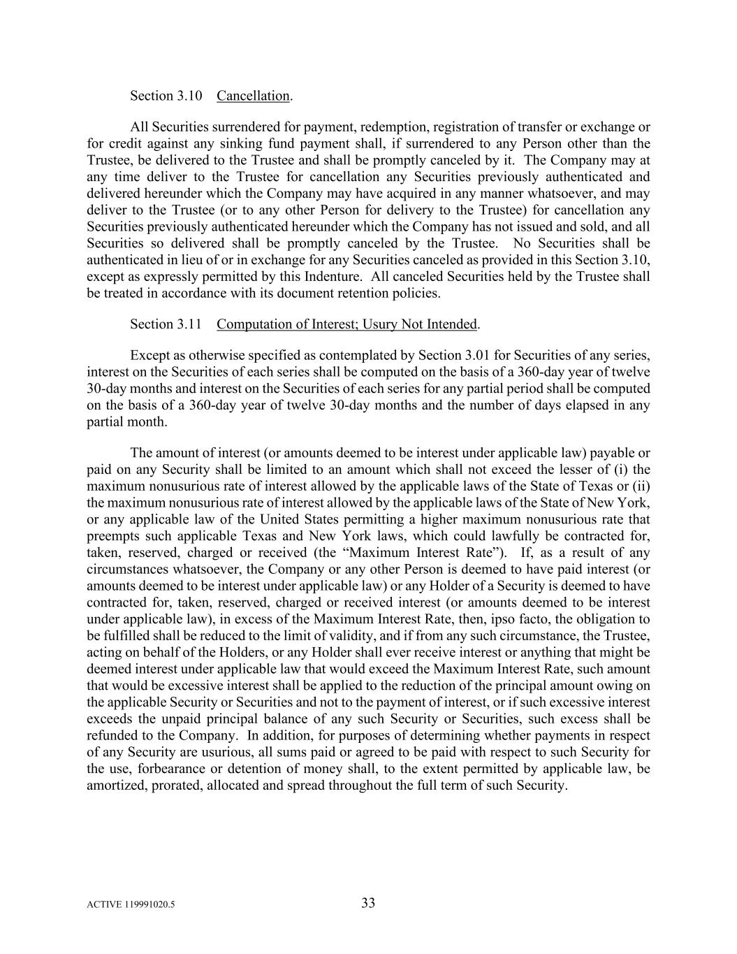 ACTIVE 119991020.5 33 Section 3.10 Cancellation. All Securities surrendered for payment, redemption, registration of transfer or exchange or for credit against any sinking fund payment shall, if surrendered to any Person other than the Trustee, be delivered to the Trustee and shall be promptly canceled by it. The Company may at any time deliver to the Trustee for cancellation any Securities previously authenticated and delivered hereunder which the Company may have acquired in any manner whatsoever, and may deliver to the Trustee (or to any other Person for delivery to the Trustee) for cancellation any Securities previously authenticated hereunder which the Company has not issued and sold, and all Securities so delivered shall be promptly canceled by the Trustee. No Securities shall be authenticated in lieu of or in exchange for any Securities canceled as provided in this Section 3.10, except as expressly permitted by this Indenture. All canceled Securities held by the Trustee shall be treated in accordance with its document retention policies. Section 3.11 Computation of Interest; Usury Not Intended. Except as otherwise specified as contemplated by Section 3.01 for Securities of any series, interest on the Securities of each series shall be computed on the basis of a 360-day year of twelve 30-day months and interest on the Securities of each series for any partial period shall be computed on the basis of a 360-day year of twelve 30-day months and the number of days elapsed in any partial month. The amount of interest (or amounts deemed to be interest under applicable law) payable or paid on any Security shall be limited to an amount which shall not exceed the lesser of (i) the maximum nonusurious rate of interest allowed by the applicable laws of the State of Texas or (ii) the maximum nonusurious rate of interest allowed by the applicable laws of the State of New York, or any applicable law of the United States permitting a higher maximum nonusurious rate that preempts such applicable Texas and New York laws, which could lawfully be contracted for, taken, reserved, charged or received (the “Maximum Interest Rate”). If, as a result of any circumstances whatsoever, the Company or any other Person is deemed to have paid interest (or amounts deemed to be interest under applicable law) or any Holder of a Security is deemed to have contracted for, taken, reserved, charged or received interest (or amounts deemed to be interest under applicable law), in excess of the Maximum Interest Rate, then, ipso facto, the obligation to be fulfilled shall be reduced to the limit of validity, and if from any such circumstance, the Trustee, acting on behalf of the Holders, or any Holder shall ever receive interest or anything that might be deemed interest under applicable law that would exceed the Maximum Interest Rate, such amount that would be excessive interest shall be applied to the reduction of the principal amount owing on the applicable Security or Securities and not to the payment of interest, or if such excessive interest exceeds the unpaid principal balance of any such Security or Securities, such excess shall be refunded to the Company. In addition, for purposes of determining whether payments in respect of any Security are usurious, all sums paid or agreed to be paid with respect to such Security for the use, forbearance or detention of money shall, to the extent permitted by applicable law, be amortized, prorated, allocated and spread throughout the full term of such Security.