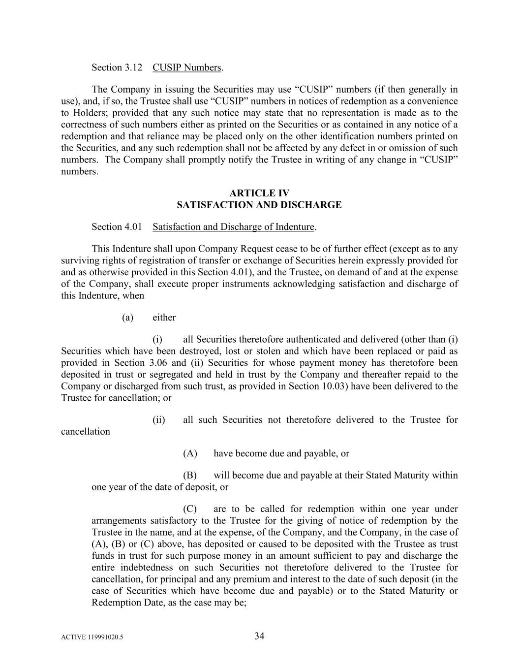 ACTIVE 119991020.5 34 Section 3.12 CUSIP Numbers. The Company in issuing the Securities may use “CUSIP” numbers (if then generally in use), and, if so, the Trustee shall use “CUSIP” numbers in notices of redemption as a convenience to Holders; provided that any such notice may state that no representation is made as to the correctness of such numbers either as printed on the Securities or as contained in any notice of a redemption and that reliance may be placed only on the other identification numbers printed on the Securities, and any such redemption shall not be affected by any defect in or omission of such numbers. The Company shall promptly notify the Trustee in writing of any change in “CUSIP” numbers. ARTICLE IV SATISFACTION AND DISCHARGE Section 4.01 Satisfaction and Discharge of Indenture. This Indenture shall upon Company Request cease to be of further effect (except as to any surviving rights of registration of transfer or exchange of Securities herein expressly provided for and as otherwise provided in this Section 4.01), and the Trustee, on demand of and at the expense of the Company, shall execute proper instruments acknowledging satisfaction and discharge of this Indenture, when (a) either (i) all Securities theretofore authenticated and delivered (other than (i) Securities which have been destroyed, lost or stolen and which have been replaced or paid as provided in Section 3.06 and (ii) Securities for whose payment money has theretofore been deposited in trust or segregated and held in trust by the Company and thereafter repaid to the Company or discharged from such trust, as provided in Section 10.03) have been delivered to the Trustee for cancellation; or (ii) all such Securities not theretofore delivered to the Trustee for cancellation (A) have become due and payable, or (B) will become due and payable at their Stated Maturity within one year of the date of deposit, or (C) are to be called for redemption within one year under arrangements satisfactory to the Trustee for the giving of notice of redemption by the Trustee in the name, and at the expense, of the Company, and the Company, in the case of (A), (B) or (C) above, has deposited or caused to be deposited with the Trustee as trust funds in trust for such purpose money in an amount sufficient to pay and discharge the entire indebtedness on such Securities not theretofore delivered to the Trustee for cancellation, for principal and any premium and interest to the date of such deposit (in the case of Securities which have become due and payable) or to the Stated Maturity or Redemption Date, as the case may be;