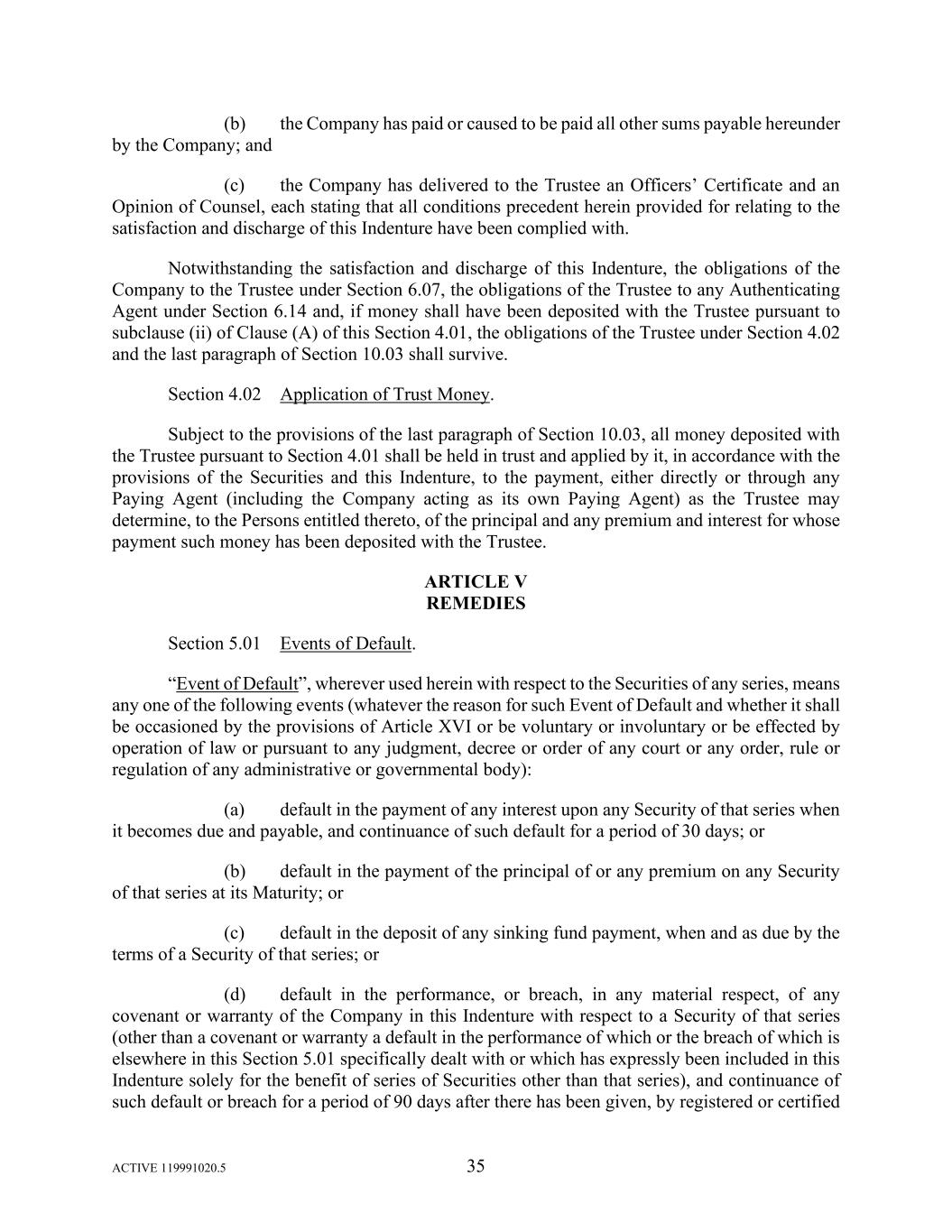 ACTIVE 119991020.5 35 (b) the Company has paid or caused to be paid all other sums payable hereunder by the Company; and (c) the Company has delivered to the Trustee an Officers’ Certificate and an Opinion of Counsel, each stating that all conditions precedent herein provided for relating to the satisfaction and discharge of this Indenture have been complied with. Notwithstanding the satisfaction and discharge of this Indenture, the obligations of the Company to the Trustee under Section 6.07, the obligations of the Trustee to any Authenticating Agent under Section 6.14 and, if money shall have been deposited with the Trustee pursuant to subclause (ii) of Clause (A) of this Section 4.01, the obligations of the Trustee under Section 4.02 and the last paragraph of Section 10.03 shall survive. Section 4.02 Application of Trust Money. Subject to the provisions of the last paragraph of Section 10.03, all money deposited with the Trustee pursuant to Section 4.01 shall be held in trust and applied by it, in accordance with the provisions of the Securities and this Indenture, to the payment, either directly or through any Paying Agent (including the Company acting as its own Paying Agent) as the Trustee may determine, to the Persons entitled thereto, of the principal and any premium and interest for whose payment such money has been deposited with the Trustee. ARTICLE V REMEDIES Section 5.01 Events of Default. “Event of Default”, wherever used herein with respect to the Securities of any series, means any one of the following events (whatever the reason for such Event of Default and whether it shall be occasioned by the provisions of Article XVI or be voluntary or involuntary or be effected by operation of law or pursuant to any judgment, decree or order of any court or any order, rule or regulation of any administrative or governmental body): (a) default in the payment of any interest upon any Security of that series when it becomes due and payable, and continuance of such default for a period of 30 days; or (b) default in the payment of the principal of or any premium on any Security of that series at its Maturity; or (c) default in the deposit of any sinking fund payment, when and as due by the terms of a Security of that series; or (d) default in the performance, or breach, in any material respect, of any covenant or warranty of the Company in this Indenture with respect to a Security of that series (other than a covenant or warranty a default in the performance of which or the breach of which is elsewhere in this Section 5.01 specifically dealt with or which has expressly been included in this Indenture solely for the benefit of series of Securities other than that series), and continuance of such default or breach for a period of 90 days after there has been given, by registered or certified