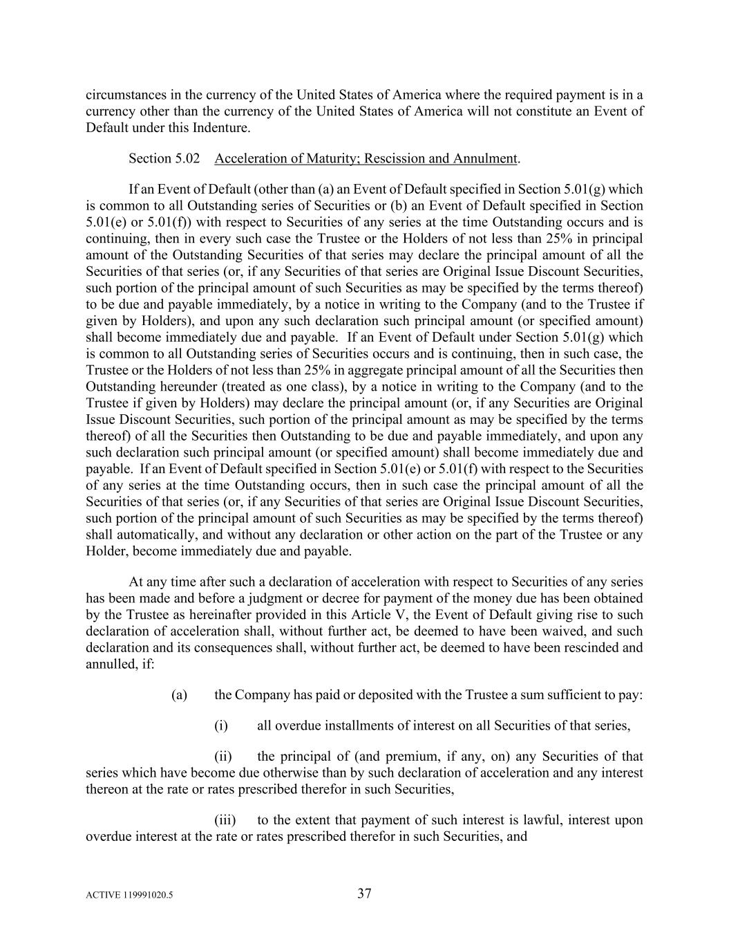 ACTIVE 119991020.5 37 circumstances in the currency of the United States of America where the required payment is in a currency other than the currency of the United States of America will not constitute an Event of Default under this Indenture. Section 5.02 Acceleration of Maturity; Rescission and Annulment. If an Event of Default (other than (a) an Event of Default specified in Section 5.01(g) which is common to all Outstanding series of Securities or (b) an Event of Default specified in Section 5.01(e) or 5.01(f)) with respect to Securities of any series at the time Outstanding occurs and is continuing, then in every such case the Trustee or the Holders of not less than 25% in principal amount of the Outstanding Securities of that series may declare the principal amount of all the Securities of that series (or, if any Securities of that series are Original Issue Discount Securities, such portion of the principal amount of such Securities as may be specified by the terms thereof) to be due and payable immediately, by a notice in writing to the Company (and to the Trustee if given by Holders), and upon any such declaration such principal amount (or specified amount) shall become immediately due and payable. If an Event of Default under Section 5.01(g) which is common to all Outstanding series of Securities occurs and is continuing, then in such case, the Trustee or the Holders of not less than 25% in aggregate principal amount of all the Securities then Outstanding hereunder (treated as one class), by a notice in writing to the Company (and to the Trustee if given by Holders) may declare the principal amount (or, if any Securities are Original Issue Discount Securities, such portion of the principal amount as may be specified by the terms thereof) of all the Securities then Outstanding to be due and payable immediately, and upon any such declaration such principal amount (or specified amount) shall become immediately due and payable. If an Event of Default specified in Section 5.01(e) or 5.01(f) with respect to the Securities of any series at the time Outstanding occurs, then in such case the principal amount of all the Securities of that series (or, if any Securities of that series are Original Issue Discount Securities, such portion of the principal amount of such Securities as may be specified by the terms thereof) shall automatically, and without any declaration or other action on the part of the Trustee or any Holder, become immediately due and payable. At any time after such a declaration of acceleration with respect to Securities of any series has been made and before a judgment or decree for payment of the money due has been obtained by the Trustee as hereinafter provided in this Article V, the Event of Default giving rise to such declaration of acceleration shall, without further act, be deemed to have been waived, and such declaration and its consequences shall, without further act, be deemed to have been rescinded and annulled, if: (a) the Company has paid or deposited with the Trustee a sum sufficient to pay: (i) all overdue installments of interest on all Securities of that series, (ii) the principal of (and premium, if any, on) any Securities of that series which have become due otherwise than by such declaration of acceleration and any interest thereon at the rate or rates prescribed therefor in such Securities, (iii) to the extent that payment of such interest is lawful, interest upon overdue interest at the rate or rates prescribed therefor in such Securities, and