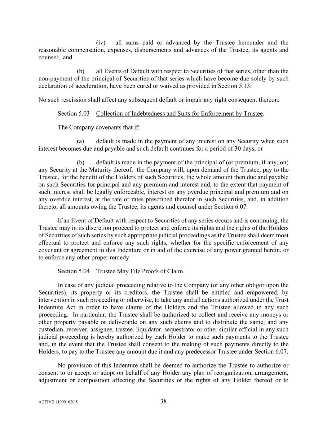 ACTIVE 119991020.5 38 (iv) all sums paid or advanced by the Trustee hereunder and the reasonable compensation, expenses, disbursements and advances of the Trustee, its agents and counsel; and (b) all Events of Default with respect to Securities of that series, other than the non-payment of the principal of Securities of that series which have become due solely by such declaration of acceleration, have been cured or waived as provided in Section 5.13. No such rescission shall affect any subsequent default or impair any right consequent thereon. Section 5.03 Collection of Indebtedness and Suits for Enforcement by Trustee. The Company covenants that if: (a) default is made in the payment of any interest on any Security when such interest becomes due and payable and such default continues for a period of 30 days, or (b) default is made in the payment of the principal of (or premium, if any, on) any Security at the Maturity thereof, the Company will, upon demand of the Trustee, pay to the Trustee, for the benefit of the Holders of such Securities, the whole amount then due and payable on such Securities for principal and any premium and interest and, to the extent that payment of such interest shall be legally enforceable, interest on any overdue principal and premium and on any overdue interest, at the rate or rates prescribed therefor in such Securities, and, in addition thereto, all amounts owing the Trustee, its agents and counsel under Section 6.07. If an Event of Default with respect to Securities of any series occurs and is continuing, the Trustee may in its discretion proceed to protect and enforce its rights and the rights of the Holders of Securities of such series by such appropriate judicial proceedings as the Trustee shall deem most effectual to protect and enforce any such rights, whether for the specific enforcement of any covenant or agreement in this Indenture or in aid of the exercise of any power granted herein, or to enforce any other proper remedy. Section 5.04 Trustee May File Proofs of Claim. In case of any judicial proceeding relative to the Company (or any other obligor upon the Securities), its property or its creditors, the Trustee shall be entitled and empowered, by intervention in such proceeding or otherwise, to take any and all actions authorized under the Trust Indenture Act in order to have claims of the Holders and the Trustee allowed in any such proceeding. In particular, the Trustee shall be authorized to collect and receive any moneys or other property payable or deliverable on any such claims and to distribute the same; and any custodian, receiver, assignee, trustee, liquidator, sequestrator or other similar official in any such judicial proceeding is hereby authorized by each Holder to make such payments to the Trustee and, in the event that the Trustee shall consent to the making of such payments directly to the Holders, to pay to the Trustee any amount due it and any predecessor Trustee under Section 6.07. No provision of this Indenture shall be deemed to authorize the Trustee to authorize or consent to or accept or adopt on behalf of any Holder any plan of reorganization, arrangement, adjustment or composition affecting the Securities or the rights of any Holder thereof or to