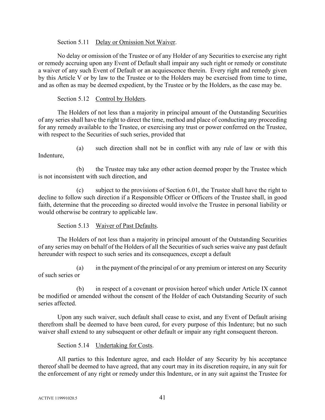ACTIVE 119991020.5 41 Section 5.11 Delay or Omission Not Waiver. No delay or omission of the Trustee or of any Holder of any Securities to exercise any right or remedy accruing upon any Event of Default shall impair any such right or remedy or constitute a waiver of any such Event of Default or an acquiescence therein. Every right and remedy given by this Article V or by law to the Trustee or to the Holders may be exercised from time to time, and as often as may be deemed expedient, by the Trustee or by the Holders, as the case may be. Section 5.12 Control by Holders. The Holders of not less than a majority in principal amount of the Outstanding Securities of any series shall have the right to direct the time, method and place of conducting any proceeding for any remedy available to the Trustee, or exercising any trust or power conferred on the Trustee, with respect to the Securities of such series, provided that (a) such direction shall not be in conflict with any rule of law or with this Indenture, (b) the Trustee may take any other action deemed proper by the Trustee which is not inconsistent with such direction, and (c) subject to the provisions of Section 6.01, the Trustee shall have the right to decline to follow such direction if a Responsible Officer or Officers of the Trustee shall, in good faith, determine that the proceeding so directed would involve the Trustee in personal liability or would otherwise be contrary to applicable law. Section 5.13 Waiver of Past Defaults. The Holders of not less than a majority in principal amount of the Outstanding Securities of any series may on behalf of the Holders of all the Securities of such series waive any past default hereunder with respect to such series and its consequences, except a default (a) in the payment of the principal of or any premium or interest on any Security of such series or (b) in respect of a covenant or provision hereof which under Article IX cannot be modified or amended without the consent of the Holder of each Outstanding Security of such series affected. Upon any such waiver, such default shall cease to exist, and any Event of Default arising therefrom shall be deemed to have been cured, for every purpose of this Indenture; but no such waiver shall extend to any subsequent or other default or impair any right consequent thereon. Section 5.14 Undertaking for Costs. All parties to this Indenture agree, and each Holder of any Security by his acceptance thereof shall be deemed to have agreed, that any court may in its discretion require, in any suit for the enforcement of any right or remedy under this Indenture, or in any suit against the Trustee for