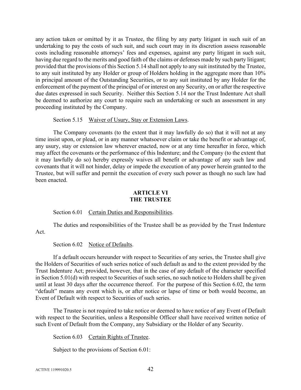 ACTIVE 119991020.5 42 any action taken or omitted by it as Trustee, the filing by any party litigant in such suit of an undertaking to pay the costs of such suit, and such court may in its discretion assess reasonable costs including reasonable attorneys’ fees and expenses, against any party litigant in such suit, having due regard to the merits and good faith of the claims or defenses made by such party litigant; provided that the provisions of this Section 5.14 shall not apply to any suit instituted by the Trustee, to any suit instituted by any Holder or group of Holders holding in the aggregate more than 10% in principal amount of the Outstanding Securities, or to any suit instituted by any Holder for the enforcement of the payment of the principal of or interest on any Security, on or after the respective due dates expressed in such Security. Neither this Section 5.14 nor the Trust Indenture Act shall be deemed to authorize any court to require such an undertaking or such an assessment in any proceeding instituted by the Company. Section 5.15 Waiver of Usury, Stay or Extension Laws. The Company covenants (to the extent that it may lawfully do so) that it will not at any time insist upon, or plead, or in any manner whatsoever claim or take the benefit or advantage of, any usury, stay or extension law wherever enacted, now or at any time hereafter in force, which may affect the covenants or the performance of this Indenture; and the Company (to the extent that it may lawfully do so) hereby expressly waives all benefit or advantage of any such law and covenants that it will not hinder, delay or impede the execution of any power herein granted to the Trustee, but will suffer and permit the execution of every such power as though no such law had been enacted. ARTICLE VI THE TRUSTEE Section 6.01 Certain Duties and Responsibilities. The duties and responsibilities of the Trustee shall be as provided by the Trust Indenture Act. Section 6.02 Notice of Defaults. If a default occurs hereunder with respect to Securities of any series, the Trustee shall give the Holders of Securities of such series notice of such default as and to the extent provided by the Trust Indenture Act; provided, however, that in the case of any default of the character specified in Section 5.01(d) with respect to Securities of such series, no such notice to Holders shall be given until at least 30 days after the occurrence thereof. For the purpose of this Section 6.02, the term “default” means any event which is, or after notice or lapse of time or both would become, an Event of Default with respect to Securities of such series. The Trustee is not required to take notice or deemed to have notice of any Event of Default with respect to the Securities, unless a Responsible Officer shall have received written notice of such Event of Default from the Company, any Subsidiary or the Holder of any Security. Section 6.03 Certain Rights of Trustee. Subject to the provisions of Section 6.01: