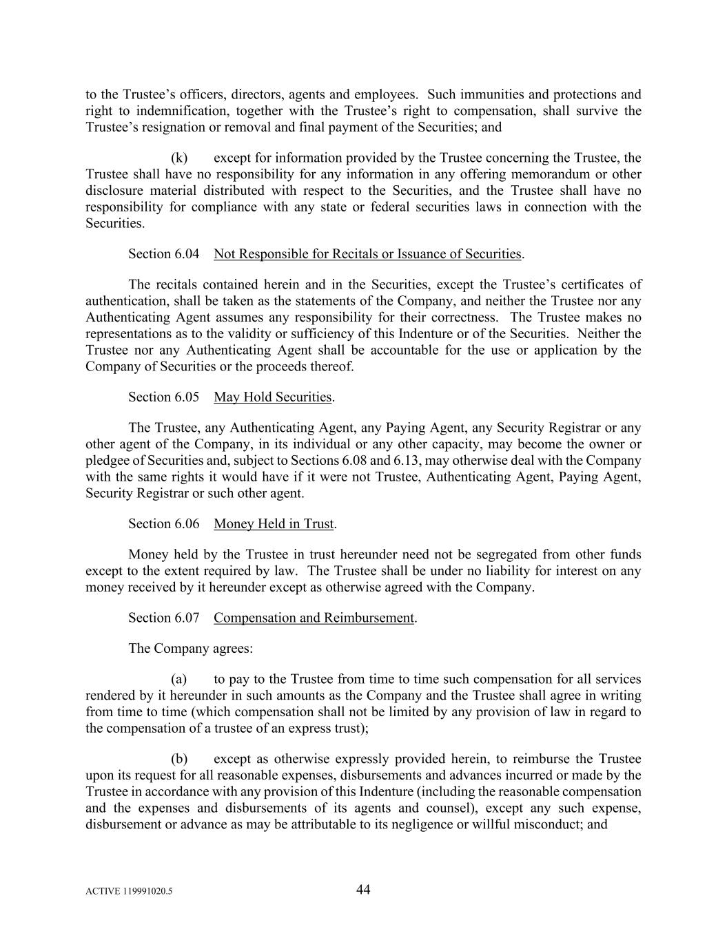 ACTIVE 119991020.5 44 to the Trustee’s officers, directors, agents and employees. Such immunities and protections and right to indemnification, together with the Trustee’s right to compensation, shall survive the Trustee’s resignation or removal and final payment of the Securities; and (k) except for information provided by the Trustee concerning the Trustee, the Trustee shall have no responsibility for any information in any offering memorandum or other disclosure material distributed with respect to the Securities, and the Trustee shall have no responsibility for compliance with any state or federal securities laws in connection with the Securities. Section 6.04 Not Responsible for Recitals or Issuance of Securities. The recitals contained herein and in the Securities, except the Trustee’s certificates of authentication, shall be taken as the statements of the Company, and neither the Trustee nor any Authenticating Agent assumes any responsibility for their correctness. The Trustee makes no representations as to the validity or sufficiency of this Indenture or of the Securities. Neither the Trustee nor any Authenticating Agent shall be accountable for the use or application by the Company of Securities or the proceeds thereof. Section 6.05 May Hold Securities. The Trustee, any Authenticating Agent, any Paying Agent, any Security Registrar or any other agent of the Company, in its individual or any other capacity, may become the owner or pledgee of Securities and, subject to Sections 6.08 and 6.13, may otherwise deal with the Company with the same rights it would have if it were not Trustee, Authenticating Agent, Paying Agent, Security Registrar or such other agent. Section 6.06 Money Held in Trust. Money held by the Trustee in trust hereunder need not be segregated from other funds except to the extent required by law. The Trustee shall be under no liability for interest on any money received by it hereunder except as otherwise agreed with the Company. Section 6.07 Compensation and Reimbursement. The Company agrees: (a) to pay to the Trustee from time to time such compensation for all services rendered by it hereunder in such amounts as the Company and the Trustee shall agree in writing from time to time (which compensation shall not be limited by any provision of law in regard to the compensation of a trustee of an express trust); (b) except as otherwise expressly provided herein, to reimburse the Trustee upon its request for all reasonable expenses, disbursements and advances incurred or made by the Trustee in accordance with any provision of this Indenture (including the reasonable compensation and the expenses and disbursements of its agents and counsel), except any such expense, disbursement or advance as may be attributable to its negligence or willful misconduct; and