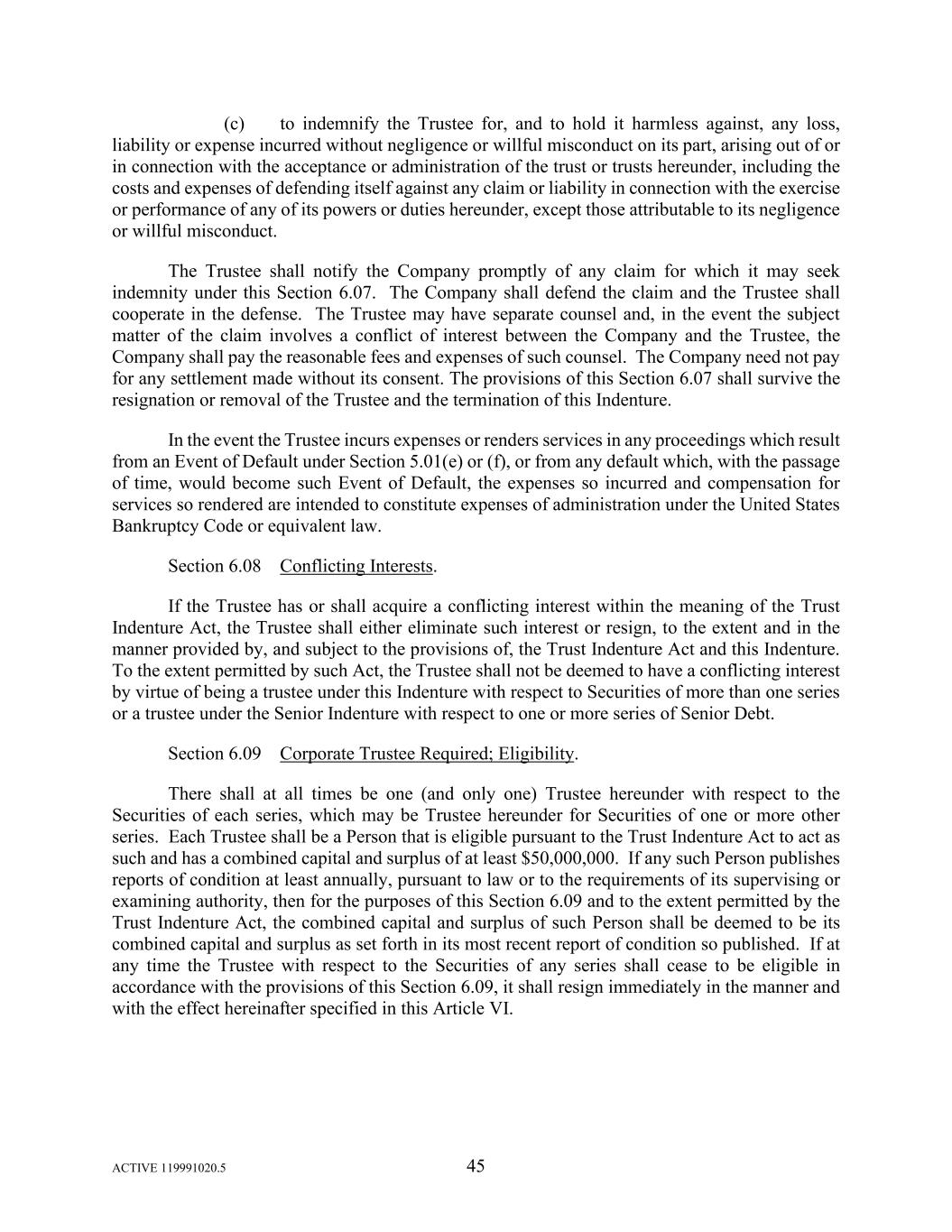 ACTIVE 119991020.5 45 (c) to indemnify the Trustee for, and to hold it harmless against, any loss, liability or expense incurred without negligence or willful misconduct on its part, arising out of or in connection with the acceptance or administration of the trust or trusts hereunder, including the costs and expenses of defending itself against any claim or liability in connection with the exercise or performance of any of its powers or duties hereunder, except those attributable to its negligence or willful misconduct. The Trustee shall notify the Company promptly of any claim for which it may seek indemnity under this Section 6.07. The Company shall defend the claim and the Trustee shall cooperate in the defense. The Trustee may have separate counsel and, in the event the subject matter of the claim involves a conflict of interest between the Company and the Trustee, the Company shall pay the reasonable fees and expenses of such counsel. The Company need not pay for any settlement made without its consent. The provisions of this Section 6.07 shall survive the resignation or removal of the Trustee and the termination of this Indenture. In the event the Trustee incurs expenses or renders services in any proceedings which result from an Event of Default under Section 5.01(e) or (f), or from any default which, with the passage of time, would become such Event of Default, the expenses so incurred and compensation for services so rendered are intended to constitute expenses of administration under the United States Bankruptcy Code or equivalent law. Section 6.08 Conflicting Interests. If the Trustee has or shall acquire a conflicting interest within the meaning of the Trust Indenture Act, the Trustee shall either eliminate such interest or resign, to the extent and in the manner provided by, and subject to the provisions of, the Trust Indenture Act and this Indenture. To the extent permitted by such Act, the Trustee shall not be deemed to have a conflicting interest by virtue of being a trustee under this Indenture with respect to Securities of more than one series or a trustee under the Senior Indenture with respect to one or more series of Senior Debt. Section 6.09 Corporate Trustee Required; Eligibility. There shall at all times be one (and only one) Trustee hereunder with respect to the Securities of each series, which may be Trustee hereunder for Securities of one or more other series. Each Trustee shall be a Person that is eligible pursuant to the Trust Indenture Act to act as such and has a combined capital and surplus of at least $50,000,000. If any such Person publishes reports of condition at least annually, pursuant to law or to the requirements of its supervising or examining authority, then for the purposes of this Section 6.09 and to the extent permitted by the Trust Indenture Act, the combined capital and surplus of such Person shall be deemed to be its combined capital and surplus as set forth in its most recent report of condition so published. If at any time the Trustee with respect to the Securities of any series shall cease to be eligible in accordance with the provisions of this Section 6.09, it shall resign immediately in the manner and with the effect hereinafter specified in this Article VI.