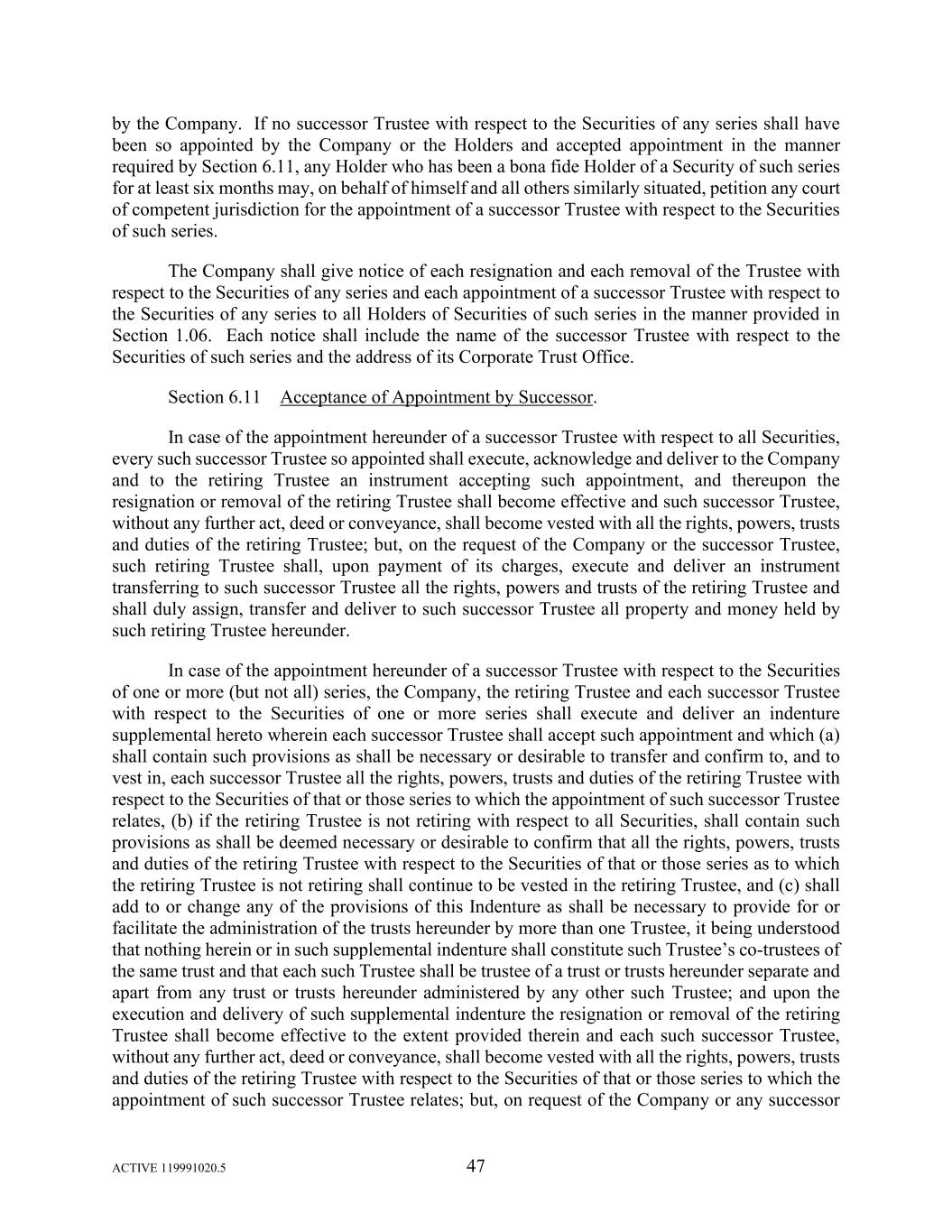 ACTIVE 119991020.5 46 Section 6.10 Resignation and Removal; Appointment of Successor. No resignation or removal of the Trustee and no appointment of a successor Trustee pursuant to this Article VI shall become effective until the acceptance of appointment by the successor Trustee in accordance with the applicable requirements of Section 6.11. The Trustee may resign at any time with respect to the Securities of one or more series by giving written notice thereof to the Company. If the instrument of acceptance by a successor Trustee required by Section 6.11 shall not have been delivered to the Trustee within 30 days after the giving of such notice of resignation, the resigning Trustee may petition any court of competent jurisdiction for the appointment of a successor Trustee with respect to the Securities of such series. The Trustee may be removed at any time with respect to the Securities of any series by Act of the Holders of a majority in principal amount of the Outstanding Securities of such series, delivered to the Trustee and to the Company. If at any time: (a) the Trustee shall fail to comply with Section 6.08 after written request therefor by the Company or by any Holder who has been a bona fide Holder of a Security for at least six months, or (b) the Trustee shall cease to be eligible under Section 6.09 and shall fail to resign after written request therefor by the Company or by any such Holder, or (c) the Trustee shall become incapable of acting or shall be adjudged a bankrupt or insolvent or a receiver of the Trustee or of its property shall be appointed or any public officer shall take charge or control of the Trustee or of its property or affairs for the purpose of rehabilitation, conservation or liquidation, then, in any such case, (i) the Company, acting pursuant to the authority of a Board Resolution, may remove the Trustee with respect to all Securities, or (ii) subject to Section 5.14, any Holder who has been a bona fide Holder of a Security for at least six months may, on behalf of himself and all others similarly situated, petition any court of competent jurisdiction for the removal of the Trustee with respect to all Securities and the appointment of a successor Trustee or Trustees. If the Trustee shall resign, be removed or become incapable of acting, or if a vacancy shall occur in the office of Trustee for any cause, with respect to the Securities of one or more series, the Company, by a Board Resolution, shall promptly appoint a successor Trustee or Trustees with respect to the Securities of that or those series (it being understood that any such successor Trustee may be appointed with respect to the Securities of one or more or all of such series and that at any time there shall be only one Trustee with respect to the Securities of any particular series) and shall comply with the applicable requirements of Section 6.11. If, within one year after such resignation, removal or incapability, or the occurrence of such vacancy, a successor Trustee with respect to the Securities of any series shall be appointed by Act of the Holders of a majority in principal amount of the Outstanding Securities of such series delivered to the Company and the retiring Trustee, the successor Trustee so appointed shall, forthwith upon its acceptance of such appointment in accordance with the applicable requirements of Section 6.11, become the successor Trustee with respect to the Securities of such series and to that extent supersede the successor Trustee appointed