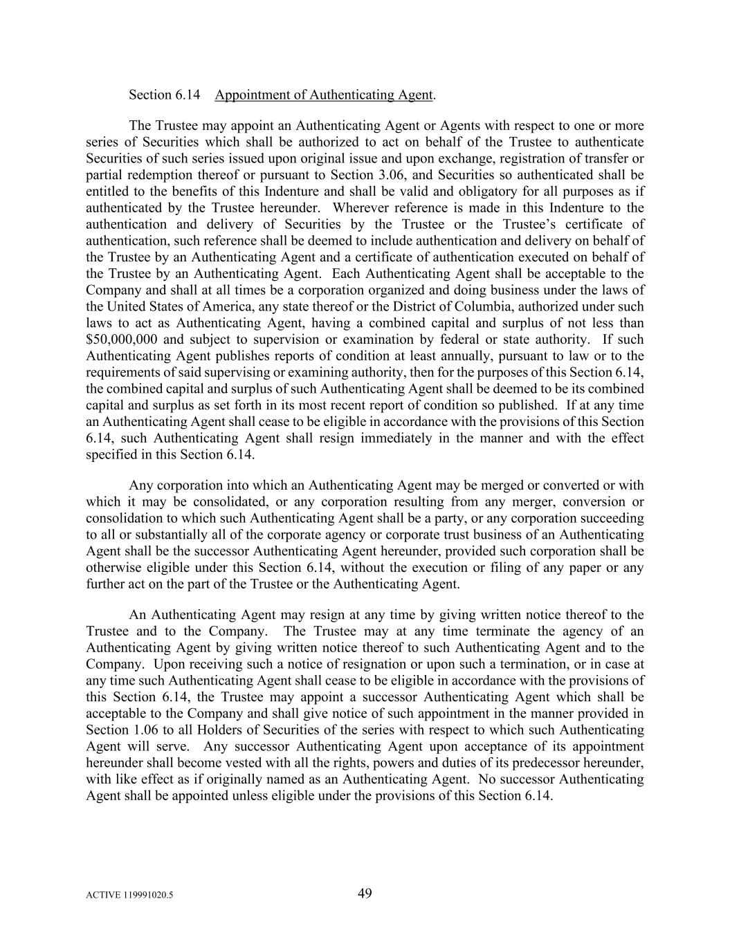 ACTIVE 119991020.5 49 Section 6.14 Appointment of Authenticating Agent. The Trustee may appoint an Authenticating Agent or Agents with respect to one or more series of Securities which shall be authorized to act on behalf of the Trustee to authenticate Securities of such series issued upon original issue and upon exchange, registration of transfer or partial redemption thereof or pursuant to Section 3.06, and Securities so authenticated shall be entitled to the benefits of this Indenture and shall be valid and obligatory for all purposes as if authenticated by the Trustee hereunder. Wherever reference is made in this Indenture to the authentication and delivery of Securities by the Trustee or the Trustee’s certificate of authentication, such reference shall be deemed to include authentication and delivery on behalf of the Trustee by an Authenticating Agent and a certificate of authentication executed on behalf of the Trustee by an Authenticating Agent. Each Authenticating Agent shall be acceptable to the Company and shall at all times be a corporation organized and doing business under the laws of the United States of America, any state thereof or the District of Columbia, authorized under such laws to act as Authenticating Agent, having a combined capital and surplus of not less than $50,000,000 and subject to supervision or examination by federal or state authority. If such Authenticating Agent publishes reports of condition at least annually, pursuant to law or to the requirements of said supervising or examining authority, then for the purposes of this Section 6.14, the combined capital and surplus of such Authenticating Agent shall be deemed to be its combined capital and surplus as set forth in its most recent report of condition so published. If at any time an Authenticating Agent shall cease to be eligible in accordance with the provisions of this Section 6.14, such Authenticating Agent shall resign immediately in the manner and with the effect specified in this Section 6.14. Any corporation into which an Authenticating Agent may be merged or converted or with which it may be consolidated, or any corporation resulting from any merger, conversion or consolidation to which such Authenticating Agent shall be a party, or any corporation succeeding to all or substantially all of the corporate agency or corporate trust business of an Authenticating Agent shall be the successor Authenticating Agent hereunder, provided such corporation shall be otherwise eligible under this Section 6.14, without the execution or filing of any paper or any further act on the part of the Trustee or the Authenticating Agent. An Authenticating Agent may resign at any time by giving written notice thereof to the Trustee and to the Company. The Trustee may at any time terminate the agency of an Authenticating Agent by giving written notice thereof to such Authenticating Agent and to the Company. Upon receiving such a notice of resignation or upon such a termination, or in case at any time such Authenticating Agent shall cease to be eligible in accordance with the provisions of this Section 6.14, the Trustee may appoint a successor Authenticating Agent which shall be acceptable to the Company and shall give notice of such appointment in the manner provided in Section 1.06 to all Holders of Securities of the series with respect to which such Authenticating Agent will serve. Any successor Authenticating Agent upon acceptance of its appointment hereunder shall become vested with all the rights, powers and duties of its predecessor hereunder, with like effect as if originally named as an Authenticating Agent. No successor Authenticating Agent shall be appointed unless eligible under the provisions of this Section 6.14.