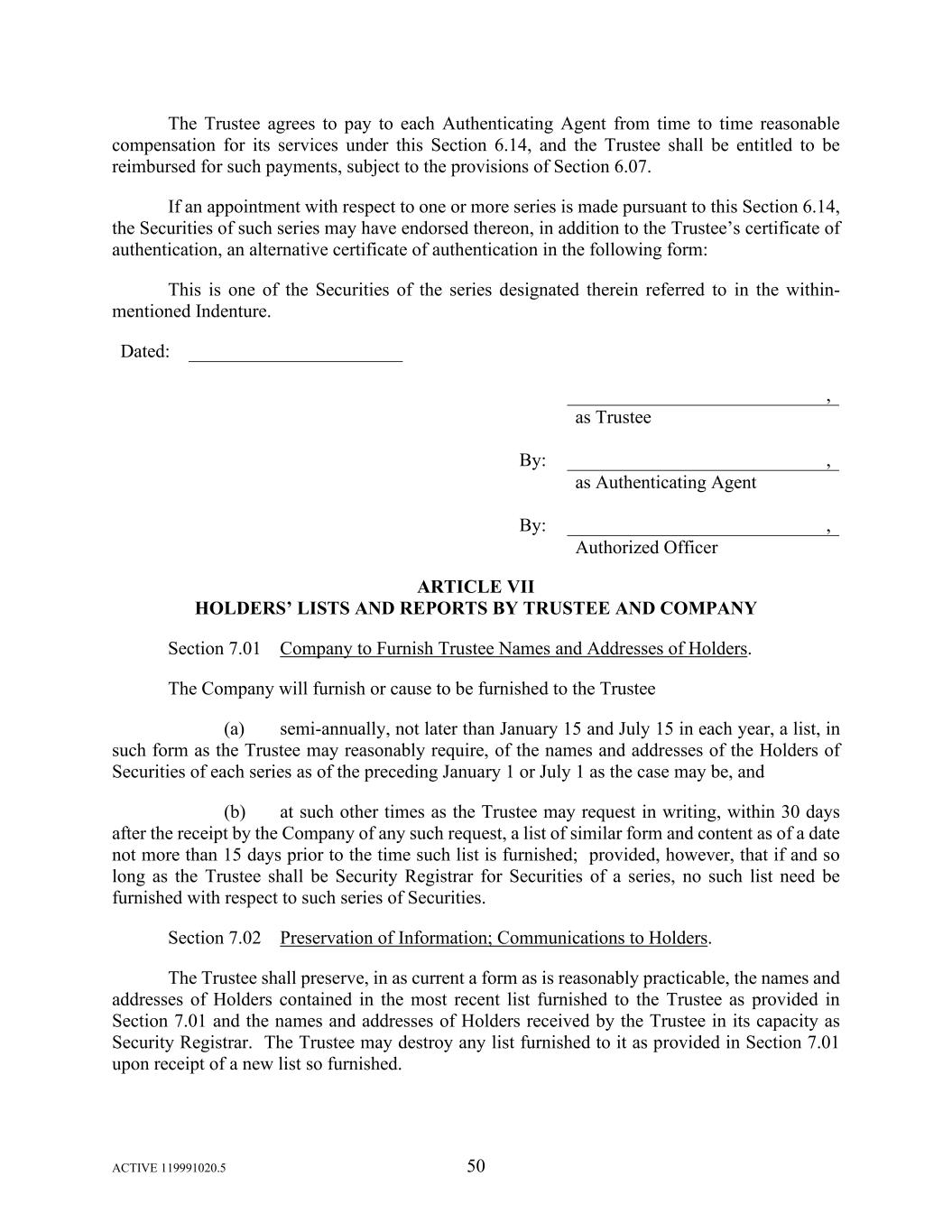 ACTIVE 119991020.5 50 The Trustee agrees to pay to each Authenticating Agent from time to time reasonable compensation for its services under this Section 6.14, and the Trustee shall be entitled to be reimbursed for such payments, subject to the provisions of Section 6.07. If an appointment with respect to one or more series is made pursuant to this Section 6.14, the Securities of such series may have endorsed thereon, in addition to the Trustee’s certificate of authentication, an alternative certificate of authentication in the following form: This is one of the Securities of the series designated therein referred to in the within- mentioned Indenture. Dated: , as Trustee By: , as Authenticating Agent By: , Authorized Officer ARTICLE VII HOLDERS’ LISTS AND REPORTS BY TRUSTEE AND COMPANY Section 7.01 Company to Furnish Trustee Names and Addresses of Holders. The Company will furnish or cause to be furnished to the Trustee (a) semi-annually, not later than January 15 and July 15 in each year, a list, in such form as the Trustee may reasonably require, of the names and addresses of the Holders of Securities of each series as of the preceding January 1 or July 1 as the case may be, and (b) at such other times as the Trustee may request in writing, within 30 days after the receipt by the Company of any such request, a list of similar form and content as of a date not more than 15 days prior to the time such list is furnished; provided, however, that if and so long as the Trustee shall be Security Registrar for Securities of a series, no such list need be furnished with respect to such series of Securities. Section 7.02 Preservation of Information; Communications to Holders. The Trustee shall preserve, in as current a form as is reasonably practicable, the names and addresses of Holders contained in the most recent list furnished to the Trustee as provided in Section 7.01 and the names and addresses of Holders received by the Trustee in its capacity as Security Registrar. The Trustee may destroy any list furnished to it as provided in Section 7.01 upon receipt of a new list so furnished.