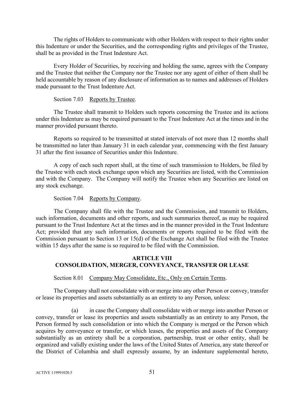 ACTIVE 119991020.5 51 The rights of Holders to communicate with other Holders with respect to their rights under this Indenture or under the Securities, and the corresponding rights and privileges of the Trustee, shall be as provided in the Trust Indenture Act. Every Holder of Securities, by receiving and holding the same, agrees with the Company and the Trustee that neither the Company nor the Trustee nor any agent of either of them shall be held accountable by reason of any disclosure of information as to names and addresses of Holders made pursuant to the Trust Indenture Act. Section 7.03 Reports by Trustee. The Trustee shall transmit to Holders such reports concerning the Trustee and its actions under this Indenture as may be required pursuant to the Trust Indenture Act at the times and in the manner provided pursuant thereto. Reports so required to be transmitted at stated intervals of not more than 12 months shall be transmitted no later than January 31 in each calendar year, commencing with the first January 31 after the first issuance of Securities under this Indenture. A copy of each such report shall, at the time of such transmission to Holders, be filed by the Trustee with each stock exchange upon which any Securities are listed, with the Commission and with the Company. The Company will notify the Trustee when any Securities are listed on any stock exchange. Section 7.04 Reports by Company. The Company shall file with the Trustee and the Commission, and transmit to Holders, such information, documents and other reports, and such summaries thereof, as may be required pursuant to the Trust Indenture Act at the times and in the manner provided in the Trust Indenture Act; provided that any such information, documents or reports required to be filed with the Commission pursuant to Section 13 or 15(d) of the Exchange Act shall be filed with the Trustee within 15 days after the same is so required to be filed with the Commission. ARTICLE VIII CONSOLIDATION, MERGER, CONVEYANCE, TRANSFER OR LEASE Section 8.01 Company May Consolidate, Etc., Only on Certain Terms. The Company shall not consolidate with or merge into any other Person or convey, transfer or lease its properties and assets substantially as an entirety to any Person, unless: (a) in case the Company shall consolidate with or merge into another Person or convey, transfer or lease its properties and assets substantially as an entirety to any Person, the Person formed by such consolidation or into which the Company is merged or the Person which acquires by conveyance or transfer, or which leases, the properties and assets of the Company substantially as an entirety shall be a corporation, partnership, trust or other entity, shall be organized and validly existing under the laws of the United States of America, any state thereof or the District of Columbia and shall expressly assume, by an indenture supplemental hereto,