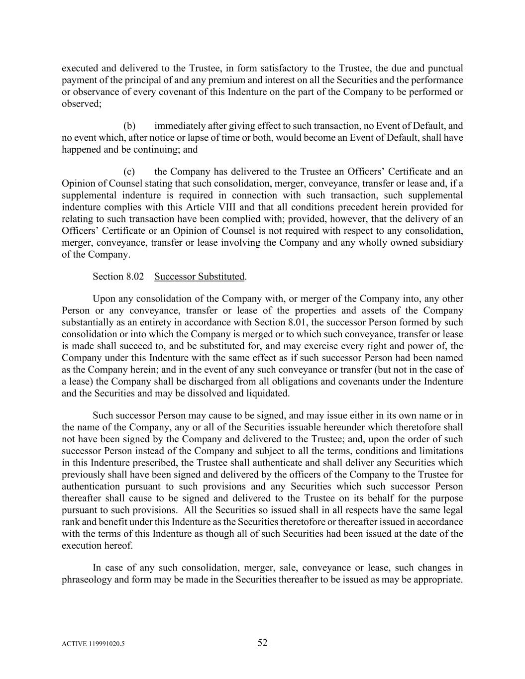 ACTIVE 119991020.5 52 executed and delivered to the Trustee, in form satisfactory to the Trustee, the due and punctual payment of the principal of and any premium and interest on all the Securities and the performance or observance of every covenant of this Indenture on the part of the Company to be performed or observed; (b) immediately after giving effect to such transaction, no Event of Default, and no event which, after notice or lapse of time or both, would become an Event of Default, shall have happened and be continuing; and (c) the Company has delivered to the Trustee an Officers’ Certificate and an Opinion of Counsel stating that such consolidation, merger, conveyance, transfer or lease and, if a supplemental indenture is required in connection with such transaction, such supplemental indenture complies with this Article VIII and that all conditions precedent herein provided for relating to such transaction have been complied with; provided, however, that the delivery of an Officers’ Certificate or an Opinion of Counsel is not required with respect to any consolidation, merger, conveyance, transfer or lease involving the Company and any wholly owned subsidiary of the Company. Section 8.02 Successor Substituted. Upon any consolidation of the Company with, or merger of the Company into, any other Person or any conveyance, transfer or lease of the properties and assets of the Company substantially as an entirety in accordance with Section 8.01, the successor Person formed by such consolidation or into which the Company is merged or to which such conveyance, transfer or lease is made shall succeed to, and be substituted for, and may exercise every right and power of, the Company under this Indenture with the same effect as if such successor Person had been named as the Company herein; and in the event of any such conveyance or transfer (but not in the case of a lease) the Company shall be discharged from all obligations and covenants under the Indenture and the Securities and may be dissolved and liquidated. Such successor Person may cause to be signed, and may issue either in its own name or in the name of the Company, any or all of the Securities issuable hereunder which theretofore shall not have been signed by the Company and delivered to the Trustee; and, upon the order of such successor Person instead of the Company and subject to all the terms, conditions and limitations in this Indenture prescribed, the Trustee shall authenticate and shall deliver any Securities which previously shall have been signed and delivered by the officers of the Company to the Trustee for authentication pursuant to such provisions and any Securities which such successor Person thereafter shall cause to be signed and delivered to the Trustee on its behalf for the purpose pursuant to such provisions. All the Securities so issued shall in all respects have the same legal rank and benefit under this Indenture as the Securities theretofore or thereafter issued in accordance with the terms of this Indenture as though all of such Securities had been issued at the date of the execution hereof. In case of any such consolidation, merger, sale, conveyance or lease, such changes in phraseology and form may be made in the Securities thereafter to be issued as may be appropriate.