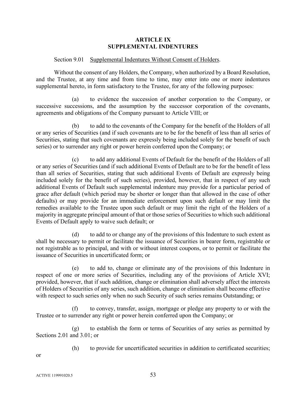 ACTIVE 119991020.5 53 ARTICLE IX SUPPLEMENTAL INDENTURES Section 9.01 Supplemental Indentures Without Consent of Holders. Without the consent of any Holders, the Company, when authorized by a Board Resolution, and the Trustee, at any time and from time to time, may enter into one or more indentures supplemental hereto, in form satisfactory to the Trustee, for any of the following purposes: (a) to evidence the succession of another corporation to the Company, or successive successions, and the assumption by the successor corporation of the covenants, agreements and obligations of the Company pursuant to Article VIII; or (b) to add to the covenants of the Company for the benefit of the Holders of all or any series of Securities (and if such covenants are to be for the benefit of less than all series of Securities, stating that such covenants are expressly being included solely for the benefit of such series) or to surrender any right or power herein conferred upon the Company; or (c) to add any additional Events of Default for the benefit of the Holders of all or any series of Securities (and if such additional Events of Default are to be for the benefit of less than all series of Securities, stating that such additional Events of Default are expressly being included solely for the benefit of such series), provided, however, that in respect of any such additional Events of Default such supplemental indenture may provide for a particular period of grace after default (which period may be shorter or longer than that allowed in the case of other defaults) or may provide for an immediate enforcement upon such default or may limit the remedies available to the Trustee upon such default or may limit the right of the Holders of a majority in aggregate principal amount of that or those series of Securities to which such additional Events of Default apply to waive such default; or (d) to add to or change any of the provisions of this Indenture to such extent as shall be necessary to permit or facilitate the issuance of Securities in bearer form, registrable or not registrable as to principal, and with or without interest coupons, or to permit or facilitate the issuance of Securities in uncertificated form; or (e) to add to, change or eliminate any of the provisions of this Indenture in respect of one or more series of Securities, including any of the provisions of Article XVI; provided, however, that if such addition, change or elimination shall adversely affect the interests of Holders of Securities of any series, such addition, change or elimination shall become effective with respect to such series only when no such Security of such series remains Outstanding; or (f) to convey, transfer, assign, mortgage or pledge any property to or with the Trustee or to surrender any right or power herein conferred upon the Company; or (g) to establish the form or terms of Securities of any series as permitted by Sections 2.01 and 3.01; or (h) to provide for uncertificated securities in addition to certificated securities; or