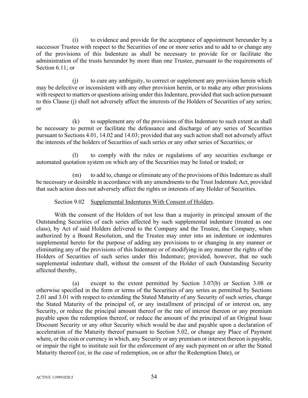 ACTIVE 119991020.5 54 (i) to evidence and provide for the acceptance of appointment hereunder by a successor Trustee with respect to the Securities of one or more series and to add to or change any of the provisions of this Indenture as shall be necessary to provide for or facilitate the administration of the trusts hereunder by more than one Trustee, pursuant to the requirements of Section 6.11; or (j) to cure any ambiguity, to correct or supplement any provision herein which may be defective or inconsistent with any other provision herein, or to make any other provisions with respect to matters or questions arising under this Indenture, provided that such action pursuant to this Clause (j) shall not adversely affect the interests of the Holders of Securities of any series; or (k) to supplement any of the provisions of this Indenture to such extent as shall be necessary to permit or facilitate the defeasance and discharge of any series of Securities pursuant to Sections 4.01, 14.02 and 14.03; provided that any such action shall not adversely affect the interests of the holders of Securities of such series or any other series of Securities; or (l) to comply with the rules or regulations of any securities exchange or automated quotation system on which any of the Securities may be listed or traded; or (m) to add to, change or eliminate any of the provisions of this Indenture as shall be necessary or desirable in accordance with any amendments to the Trust Indenture Act, provided that such action does not adversely affect the rights or interests of any Holder of Securities. Section 9.02 Supplemental Indentures With Consent of Holders. With the consent of the Holders of not less than a majority in principal amount of the Outstanding Securities of each series affected by such supplemental indenture (treated as one class), by Act of said Holders delivered to the Company and the Trustee, the Company, when authorized by a Board Resolution, and the Trustee may enter into an indenture or indentures supplemental hereto for the purpose of adding any provisions to or changing in any manner or eliminating any of the provisions of this Indenture or of modifying in any manner the rights of the Holders of Securities of such series under this Indenture; provided, however, that no such supplemental indenture shall, without the consent of the Holder of each Outstanding Security affected thereby, (a) except to the extent permitted by Section 3.07(b) or Section 3.08 or otherwise specified in the form or terms of the Securities of any series as permitted by Sections 2.01 and 3.01 with respect to extending the Stated Maturity of any Security of such series, change the Stated Maturity of the principal of, or any installment of principal of or interest on, any Security, or reduce the principal amount thereof or the rate of interest thereon or any premium payable upon the redemption thereof, or reduce the amount of the principal of an Original Issue Discount Security or any other Security which would be due and payable upon a declaration of acceleration of the Maturity thereof pursuant to Section 5.02, or change any Place of Payment where, or the coin or currency in which, any Security or any premium or interest thereon is payable, or impair the right to institute suit for the enforcement of any such payment on or after the Stated Maturity thereof (or, in the case of redemption, on or after the Redemption Date), or
