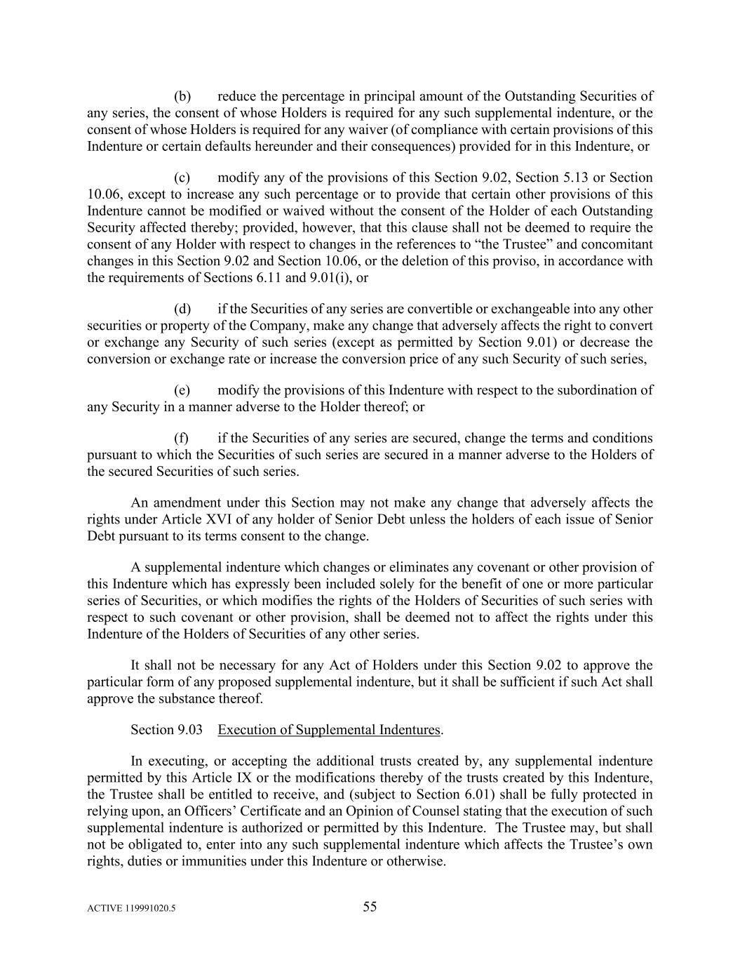 ACTIVE 119991020.5 55 (b) reduce the percentage in principal amount of the Outstanding Securities of any series, the consent of whose Holders is required for any such supplemental indenture, or the consent of whose Holders is required for any waiver (of compliance with certain provisions of this Indenture or certain defaults hereunder and their consequences) provided for in this Indenture, or (c) modify any of the provisions of this Section 9.02, Section 5.13 or Section 10.06, except to increase any such percentage or to provide that certain other provisions of this Indenture cannot be modified or waived without the consent of the Holder of each Outstanding Security affected thereby; provided, however, that this clause shall not be deemed to require the consent of any Holder with respect to changes in the references to “the Trustee” and concomitant changes in this Section 9.02 and Section 10.06, or the deletion of this proviso, in accordance with the requirements of Sections 6.11 and 9.01(i), or (d) if the Securities of any series are convertible or exchangeable into any other securities or property of the Company, make any change that adversely affects the right to convert or exchange any Security of such series (except as permitted by Section 9.01) or decrease the conversion or exchange rate or increase the conversion price of any such Security of such series, (e) modify the provisions of this Indenture with respect to the subordination of any Security in a manner adverse to the Holder thereof; or (f) if the Securities of any series are secured, change the terms and conditions pursuant to which the Securities of such series are secured in a manner adverse to the Holders of the secured Securities of such series. An amendment under this Section may not make any change that adversely affects the rights under Article XVI of any holder of Senior Debt unless the holders of each issue of Senior Debt pursuant to its terms consent to the change. A supplemental indenture which changes or eliminates any covenant or other provision of this Indenture which has expressly been included solely for the benefit of one or more particular series of Securities, or which modifies the rights of the Holders of Securities of such series with respect to such covenant or other provision, shall be deemed not to affect the rights under this Indenture of the Holders of Securities of any other series. It shall not be necessary for any Act of Holders under this Section 9.02 to approve the particular form of any proposed supplemental indenture, but it shall be sufficient if such Act shall approve the substance thereof. Section 9.03 Execution of Supplemental Indentures. In executing, or accepting the additional trusts created by, any supplemental indenture permitted by this Article IX or the modifications thereby of the trusts created by this Indenture, the Trustee shall be entitled to receive, and (subject to Section 6.01) shall be fully protected in relying upon, an Officers’ Certificate and an Opinion of Counsel stating that the execution of such supplemental indenture is authorized or permitted by this Indenture. The Trustee may, but shall not be obligated to, enter into any such supplemental indenture which affects the Trustee’s own rights, duties or immunities under this Indenture or otherwise.