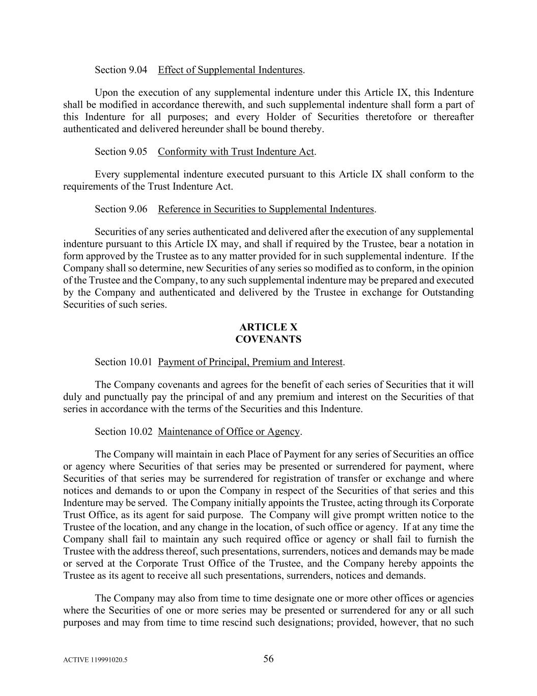 ACTIVE 119991020.5 56 Section 9.04 Effect of Supplemental Indentures. Upon the execution of any supplemental indenture under this Article IX, this Indenture shall be modified in accordance therewith, and such supplemental indenture shall form a part of this Indenture for all purposes; and every Holder of Securities theretofore or thereafter authenticated and delivered hereunder shall be bound thereby. Section 9.05 Conformity with Trust Indenture Act. Every supplemental indenture executed pursuant to this Article IX shall conform to the requirements of the Trust Indenture Act. Section 9.06 Reference in Securities to Supplemental Indentures. Securities of any series authenticated and delivered after the execution of any supplemental indenture pursuant to this Article IX may, and shall if required by the Trustee, bear a notation in form approved by the Trustee as to any matter provided for in such supplemental indenture. If the Company shall so determine, new Securities of any series so modified as to conform, in the opinion of the Trustee and the Company, to any such supplemental indenture may be prepared and executed by the Company and authenticated and delivered by the Trustee in exchange for Outstanding Securities of such series. ARTICLE X COVENANTS Section 10.01 Payment of Principal, Premium and Interest. The Company covenants and agrees for the benefit of each series of Securities that it will duly and punctually pay the principal of and any premium and interest on the Securities of that series in accordance with the terms of the Securities and this Indenture. Section 10.02 Maintenance of Office or Agency. The Company will maintain in each Place of Payment for any series of Securities an office or agency where Securities of that series may be presented or surrendered for payment, where Securities of that series may be surrendered for registration of transfer or exchange and where notices and demands to or upon the Company in respect of the Securities of that series and this Indenture may be served. The Company initially appoints the Trustee, acting through its Corporate Trust Office, as its agent for said purpose. The Company will give prompt written notice to the Trustee of the location, and any change in the location, of such office or agency. If at any time the Company shall fail to maintain any such required office or agency or shall fail to furnish the Trustee with the address thereof, such presentations, surrenders, notices and demands may be made or served at the Corporate Trust Office of the Trustee, and the Company hereby appoints the Trustee as its agent to receive all such presentations, surrenders, notices and demands. The Company may also from time to time designate one or more other offices or agencies where the Securities of one or more series may be presented or surrendered for any or all such purposes and may from time to time rescind such designations; provided, however, that no such