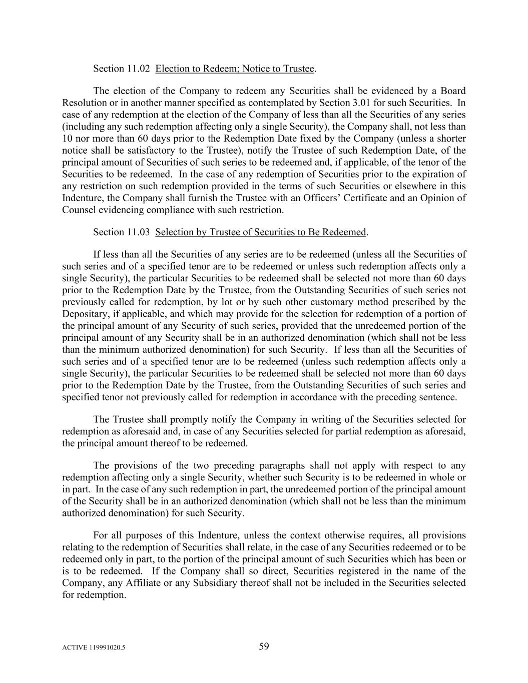 ACTIVE 119991020.5 59 Section 11.02 Election to Redeem; Notice to Trustee. The election of the Company to redeem any Securities shall be evidenced by a Board Resolution or in another manner specified as contemplated by Section 3.01 for such Securities. In case of any redemption at the election of the Company of less than all the Securities of any series (including any such redemption affecting only a single Security), the Company shall, not less than 10 nor more than 60 days prior to the Redemption Date fixed by the Company (unless a shorter notice shall be satisfactory to the Trustee), notify the Trustee of such Redemption Date, of the principal amount of Securities of such series to be redeemed and, if applicable, of the tenor of the Securities to be redeemed. In the case of any redemption of Securities prior to the expiration of any restriction on such redemption provided in the terms of such Securities or elsewhere in this Indenture, the Company shall furnish the Trustee with an Officers’ Certificate and an Opinion of Counsel evidencing compliance with such restriction. Section 11.03 Selection by Trustee of Securities to Be Redeemed. If less than all the Securities of any series are to be redeemed (unless all the Securities of such series and of a specified tenor are to be redeemed or unless such redemption affects only a single Security), the particular Securities to be redeemed shall be selected not more than 60 days prior to the Redemption Date by the Trustee, from the Outstanding Securities of such series not previously called for redemption, by lot or by such other customary method prescribed by the Depositary, if applicable, and which may provide for the selection for redemption of a portion of the principal amount of any Security of such series, provided that the unredeemed portion of the principal amount of any Security shall be in an authorized denomination (which shall not be less than the minimum authorized denomination) for such Security. If less than all the Securities of such series and of a specified tenor are to be redeemed (unless such redemption affects only a single Security), the particular Securities to be redeemed shall be selected not more than 60 days prior to the Redemption Date by the Trustee, from the Outstanding Securities of such series and specified tenor not previously called for redemption in accordance with the preceding sentence. The Trustee shall promptly notify the Company in writing of the Securities selected for redemption as aforesaid and, in case of any Securities selected for partial redemption as aforesaid, the principal amount thereof to be redeemed. The provisions of the two preceding paragraphs shall not apply with respect to any redemption affecting only a single Security, whether such Security is to be redeemed in whole or in part. In the case of any such redemption in part, the unredeemed portion of the principal amount of the Security shall be in an authorized denomination (which shall not be less than the minimum authorized denomination) for such Security. For all purposes of this Indenture, unless the context otherwise requires, all provisions relating to the redemption of Securities shall relate, in the case of any Securities redeemed or to be redeemed only in part, to the portion of the principal amount of such Securities which has been or is to be redeemed. If the Company shall so direct, Securities registered in the name of the Company, any Affiliate or any Subsidiary thereof shall not be included in the Securities selected for redemption.