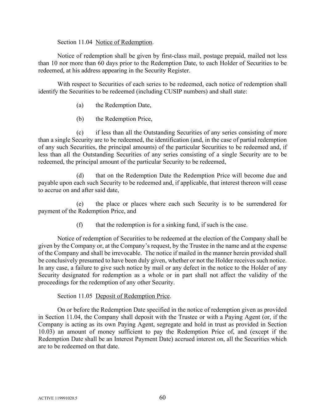 ACTIVE 119991020.5 60 Section 11.04 Notice of Redemption. Notice of redemption shall be given by first-class mail, postage prepaid, mailed not less than 10 nor more than 60 days prior to the Redemption Date, to each Holder of Securities to be redeemed, at his address appearing in the Security Register. With respect to Securities of each series to be redeemed, each notice of redemption shall identify the Securities to be redeemed (including CUSIP numbers) and shall state: (a) the Redemption Date, (b) the Redemption Price, (c) if less than all the Outstanding Securities of any series consisting of more than a single Security are to be redeemed, the identification (and, in the case of partial redemption of any such Securities, the principal amounts) of the particular Securities to be redeemed and, if less than all the Outstanding Securities of any series consisting of a single Security are to be redeemed, the principal amount of the particular Security to be redeemed, (d) that on the Redemption Date the Redemption Price will become due and payable upon each such Security to be redeemed and, if applicable, that interest thereon will cease to accrue on and after said date, (e) the place or places where each such Security is to be surrendered for payment of the Redemption Price, and (f) that the redemption is for a sinking fund, if such is the case. Notice of redemption of Securities to be redeemed at the election of the Company shall be given by the Company or, at the Company’s request, by the Trustee in the name and at the expense of the Company and shall be irrevocable. The notice if mailed in the manner herein provided shall be conclusively presumed to have been duly given, whether or not the Holder receives such notice. In any case, a failure to give such notice by mail or any defect in the notice to the Holder of any Security designated for redemption as a whole or in part shall not affect the validity of the proceedings for the redemption of any other Security. Section 11.05 Deposit of Redemption Price. On or before the Redemption Date specified in the notice of redemption given as provided in Section 11.04, the Company shall deposit with the Trustee or with a Paying Agent (or, if the Company is acting as its own Paying Agent, segregate and hold in trust as provided in Section 10.03) an amount of money sufficient to pay the Redemption Price of, and (except if the Redemption Date shall be an Interest Payment Date) accrued interest on, all the Securities which are to be redeemed on that date.