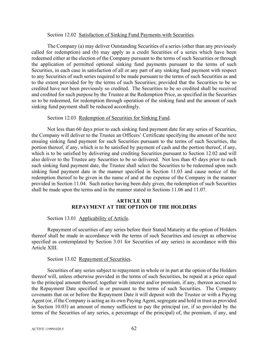 ACTIVE 119991020.5 62 Section 12.02 Satisfaction of Sinking Fund Payments with Securities. The Company (a) may deliver Outstanding Securities of a series (other than any previously called for redemption) and (b) may apply as a credit Securities of a series which have been redeemed either at the election of the Company pursuant to the terms of such Securities or through the application of permitted optional sinking fund payments pursuant to the terms of such Securities, in each case in satisfaction of all or any part of any sinking fund payment with respect to any Securities of such series required to be made pursuant to the terms of such Securities as and to the extent provided for by the terms of such Securities; provided that the Securities to be so credited have not been previously so credited. The Securities to be so credited shall be received and credited for such purpose by the Trustee at the Redemption Price, as specified in the Securities so to be redeemed, for redemption through operation of the sinking fund and the amount of such sinking fund payment shall be reduced accordingly. Section 12.03 Redemption of Securities for Sinking Fund. Not less than 60 days prior to each sinking fund payment date for any series of Securities, the Company will deliver to the Trustee an Officers’ Certificate specifying the amount of the next ensuing sinking fund payment for such Securities pursuant to the terms of such Securities, the portion thereof, if any, which is to be satisfied by payment of cash and the portion thereof, if any, which is to be satisfied by delivering and crediting Securities pursuant to Section 12.02 and will also deliver to the Trustee any Securities to be so delivered. Not less than 45 days prior to each such sinking fund payment date, the Trustee shall select the Securities to be redeemed upon such sinking fund payment date in the manner specified in Section 11.03 and cause notice of the redemption thereof to be given in the name of and at the expense of the Company in the manner provided in Section 11.04. Such notice having been duly given, the redemption of such Securities shall be made upon the terms and in the manner stated in Sections 11.06 and 11.07. ARTICLE XIII REPAYMENT AT THE OPTION OF THE HOLDERS Section 13.01 Applicability of Article. Repayment of securities of any series before their Stated Maturity at the option of Holders thereof shall be made in accordance with the terms of such Securities and (except as otherwise specified as contemplated by Section 3.01 for Securities of any series) in accordance with this Article XIII. Section 13.02 Repayment of Securities. Securities of any series subject to repayment in whole or in part at the option of the Holders thereof will, unless otherwise provided in the terms of such Securities, be repaid at a price equal to the principal amount thereof, together with interest and/or premium, if any, thereon accrued to the Repayment Date specified in or pursuant to the terms of such Securities. The Company covenants that on or before the Repayment Date it will deposit with the Trustee or with a Paying Agent (or, if the Company is acting as its own Paying Agent, segregate and hold in trust as provided in Section 10.03) an amount of money sufficient to pay the principal (or, if so provided by the terms of the Securities of any series, a percentage of the principal) of, the premium, if any, and