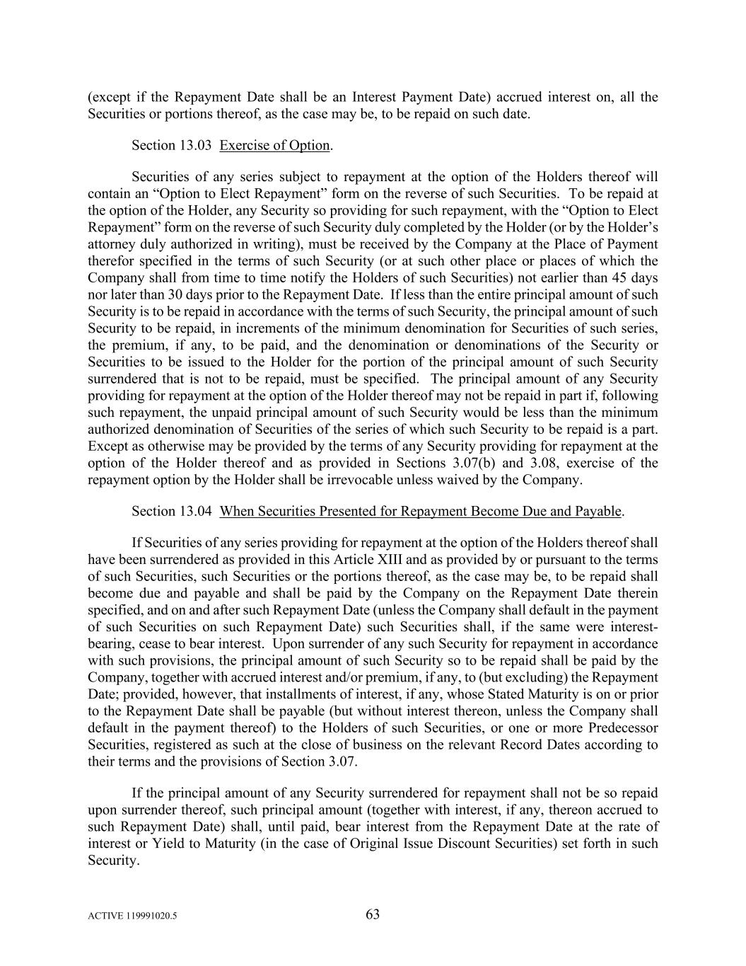 ACTIVE 119991020.5 63 (except if the Repayment Date shall be an Interest Payment Date) accrued interest on, all the Securities or portions thereof, as the case may be, to be repaid on such date. Section 13.03 Exercise of Option. Securities of any series subject to repayment at the option of the Holders thereof will contain an “Option to Elect Repayment” form on the reverse of such Securities. To be repaid at the option of the Holder, any Security so providing for such repayment, with the “Option to Elect Repayment” form on the reverse of such Security duly completed by the Holder (or by the Holder’s attorney duly authorized in writing), must be received by the Company at the Place of Payment therefor specified in the terms of such Security (or at such other place or places of which the Company shall from time to time notify the Holders of such Securities) not earlier than 45 days nor later than 30 days prior to the Repayment Date. If less than the entire principal amount of such Security is to be repaid in accordance with the terms of such Security, the principal amount of such Security to be repaid, in increments of the minimum denomination for Securities of such series, the premium, if any, to be paid, and the denomination or denominations of the Security or Securities to be issued to the Holder for the portion of the principal amount of such Security surrendered that is not to be repaid, must be specified. The principal amount of any Security providing for repayment at the option of the Holder thereof may not be repaid in part if, following such repayment, the unpaid principal amount of such Security would be less than the minimum authorized denomination of Securities of the series of which such Security to be repaid is a part. Except as otherwise may be provided by the terms of any Security providing for repayment at the option of the Holder thereof and as provided in Sections 3.07(b) and 3.08, exercise of the repayment option by the Holder shall be irrevocable unless waived by the Company. Section 13.04 When Securities Presented for Repayment Become Due and Payable. If Securities of any series providing for repayment at the option of the Holders thereof shall have been surrendered as provided in this Article XIII and as provided by or pursuant to the terms of such Securities, such Securities or the portions thereof, as the case may be, to be repaid shall become due and payable and shall be paid by the Company on the Repayment Date therein specified, and on and after such Repayment Date (unless the Company shall default in the payment of such Securities on such Repayment Date) such Securities shall, if the same were interest- bearing, cease to bear interest. Upon surrender of any such Security for repayment in accordance with such provisions, the principal amount of such Security so to be repaid shall be paid by the Company, together with accrued interest and/or premium, if any, to (but excluding) the Repayment Date; provided, however, that installments of interest, if any, whose Stated Maturity is on or prior to the Repayment Date shall be payable (but without interest thereon, unless the Company shall default in the payment thereof) to the Holders of such Securities, or one or more Predecessor Securities, registered as such at the close of business on the relevant Record Dates according to their terms and the provisions of Section 3.07. If the principal amount of any Security surrendered for repayment shall not be so repaid upon surrender thereof, such principal amount (together with interest, if any, thereon accrued to such Repayment Date) shall, until paid, bear interest from the Repayment Date at the rate of interest or Yield to Maturity (in the case of Original Issue Discount Securities) set forth in such Security.