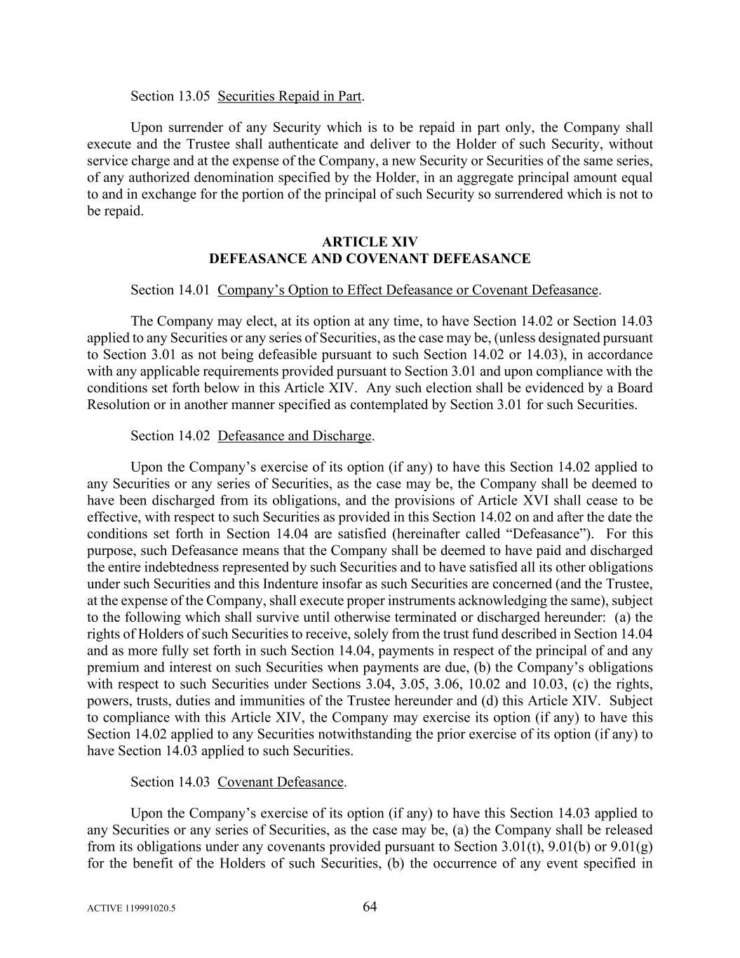 ACTIVE 119991020.5 64 Section 13.05 Securities Repaid in Part. Upon surrender of any Security which is to be repaid in part only, the Company shall execute and the Trustee shall authenticate and deliver to the Holder of such Security, without service charge and at the expense of the Company, a new Security or Securities of the same series, of any authorized denomination specified by the Holder, in an aggregate principal amount equal to and in exchange for the portion of the principal of such Security so surrendered which is not to be repaid. ARTICLE XIV DEFEASANCE AND COVENANT DEFEASANCE Section 14.01 Company’s Option to Effect Defeasance or Covenant Defeasance. The Company may elect, at its option at any time, to have Section 14.02 or Section 14.03 applied to any Securities or any series of Securities, as the case may be, (unless designated pursuant to Section 3.01 as not being defeasible pursuant to such Section 14.02 or 14.03), in accordance with any applicable requirements provided pursuant to Section 3.01 and upon compliance with the conditions set forth below in this Article XIV. Any such election shall be evidenced by a Board Resolution or in another manner specified as contemplated by Section 3.01 for such Securities. Section 14.02 Defeasance and Discharge. Upon the Company’s exercise of its option (if any) to have this Section 14.02 applied to any Securities or any series of Securities, as the case may be, the Company shall be deemed to have been discharged from its obligations, and the provisions of Article XVI shall cease to be effective, with respect to such Securities as provided in this Section 14.02 on and after the date the conditions set forth in Section 14.04 are satisfied (hereinafter called “Defeasance”). For this purpose, such Defeasance means that the Company shall be deemed to have paid and discharged the entire indebtedness represented by such Securities and to have satisfied all its other obligations under such Securities and this Indenture insofar as such Securities are concerned (and the Trustee, at the expense of the Company, shall execute proper instruments acknowledging the same), subject to the following which shall survive until otherwise terminated or discharged hereunder: (a) the rights of Holders of such Securities to receive, solely from the trust fund described in Section 14.04 and as more fully set forth in such Section 14.04, payments in respect of the principal of and any premium and interest on such Securities when payments are due, (b) the Company’s obligations with respect to such Securities under Sections 3.04, 3.05, 3.06, 10.02 and 10.03, (c) the rights, powers, trusts, duties and immunities of the Trustee hereunder and (d) this Article XIV. Subject to compliance with this Article XIV, the Company may exercise its option (if any) to have this Section 14.02 applied to any Securities notwithstanding the prior exercise of its option (if any) to have Section 14.03 applied to such Securities. Section 14.03 Covenant Defeasance. Upon the Company’s exercise of its option (if any) to have this Section 14.03 applied to any Securities or any series of Securities, as the case may be, (a) the Company shall be released from its obligations under any covenants provided pursuant to Section 3.01(t), 9.01(b) or 9.01(g) for the benefit of the Holders of such Securities, (b) the occurrence of any event specified in