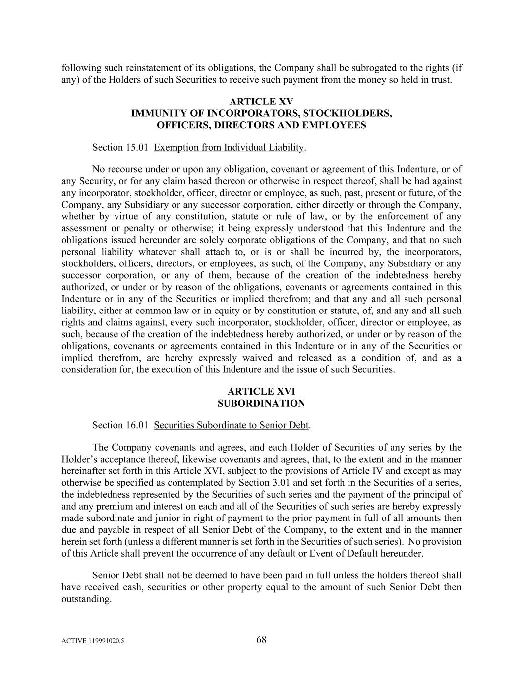 ACTIVE 119991020.5 68 following such reinstatement of its obligations, the Company shall be subrogated to the rights (if any) of the Holders of such Securities to receive such payment from the money so held in trust. ARTICLE XV IMMUNITY OF INCORPORATORS, STOCKHOLDERS, OFFICERS, DIRECTORS AND EMPLOYEES Section 15.01 Exemption from Individual Liability. No recourse under or upon any obligation, covenant or agreement of this Indenture, or of any Security, or for any claim based thereon or otherwise in respect thereof, shall be had against any incorporator, stockholder, officer, director or employee, as such, past, present or future, of the Company, any Subsidiary or any successor corporation, either directly or through the Company, whether by virtue of any constitution, statute or rule of law, or by the enforcement of any assessment or penalty or otherwise; it being expressly understood that this Indenture and the obligations issued hereunder are solely corporate obligations of the Company, and that no such personal liability whatever shall attach to, or is or shall be incurred by, the incorporators, stockholders, officers, directors, or employees, as such, of the Company, any Subsidiary or any successor corporation, or any of them, because of the creation of the indebtedness hereby authorized, or under or by reason of the obligations, covenants or agreements contained in this Indenture or in any of the Securities or implied therefrom; and that any and all such personal liability, either at common law or in equity or by constitution or statute, of, and any and all such rights and claims against, every such incorporator, stockholder, officer, director or employee, as such, because of the creation of the indebtedness hereby authorized, or under or by reason of the obligations, covenants or agreements contained in this Indenture or in any of the Securities or implied therefrom, are hereby expressly waived and released as a condition of, and as a consideration for, the execution of this Indenture and the issue of such Securities. ARTICLE XVI SUBORDINATION Section 16.01 Securities Subordinate to Senior Debt. The Company covenants and agrees, and each Holder of Securities of any series by the Holder’s acceptance thereof, likewise covenants and agrees, that, to the extent and in the manner hereinafter set forth in this Article XVI, subject to the provisions of Article IV and except as may otherwise be specified as contemplated by Section 3.01 and set forth in the Securities of a series, the indebtedness represented by the Securities of such series and the payment of the principal of and any premium and interest on each and all of the Securities of such series are hereby expressly made subordinate and junior in right of payment to the prior payment in full of all amounts then due and payable in respect of all Senior Debt of the Company, to the extent and in the manner herein set forth (unless a different manner is set forth in the Securities of such series). No provision of this Article shall prevent the occurrence of any default or Event of Default hereunder. Senior Debt shall not be deemed to have been paid in full unless the holders thereof shall have received cash, securities or other property equal to the amount of such Senior Debt then outstanding.