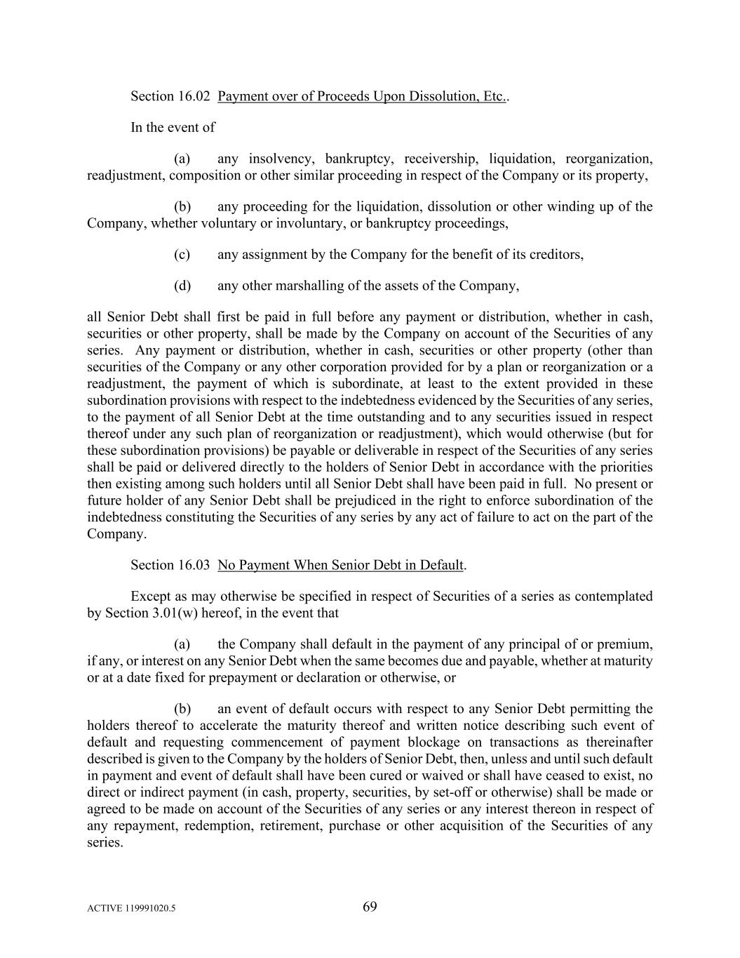 ACTIVE 119991020.5 69 Section 16.02 Payment over of Proceeds Upon Dissolution, Etc.. In the event of (a) any insolvency, bankruptcy, receivership, liquidation, reorganization, readjustment, composition or other similar proceeding in respect of the Company or its property, (b) any proceeding for the liquidation, dissolution or other winding up of the Company, whether voluntary or involuntary, or bankruptcy proceedings, (c) any assignment by the Company for the benefit of its creditors, (d) any other marshalling of the assets of the Company, all Senior Debt shall first be paid in full before any payment or distribution, whether in cash, securities or other property, shall be made by the Company on account of the Securities of any series. Any payment or distribution, whether in cash, securities or other property (other than securities of the Company or any other corporation provided for by a plan or reorganization or a readjustment, the payment of which is subordinate, at least to the extent provided in these subordination provisions with respect to the indebtedness evidenced by the Securities of any series, to the payment of all Senior Debt at the time outstanding and to any securities issued in respect thereof under any such plan of reorganization or readjustment), which would otherwise (but for these subordination provisions) be payable or deliverable in respect of the Securities of any series shall be paid or delivered directly to the holders of Senior Debt in accordance with the priorities then existing among such holders until all Senior Debt shall have been paid in full. No present or future holder of any Senior Debt shall be prejudiced in the right to enforce subordination of the indebtedness constituting the Securities of any series by any act of failure to act on the part of the Company. Section 16.03 No Payment When Senior Debt in Default. Except as may otherwise be specified in respect of Securities of a series as contemplated by Section 3.01(w) hereof, in the event that (a) the Company shall default in the payment of any principal of or premium, if any, or interest on any Senior Debt when the same becomes due and payable, whether at maturity or at a date fixed for prepayment or declaration or otherwise, or (b) an event of default occurs with respect to any Senior Debt permitting the holders thereof to accelerate the maturity thereof and written notice describing such event of default and requesting commencement of payment blockage on transactions as thereinafter described is given to the Company by the holders of Senior Debt, then, unless and until such default in payment and event of default shall have been cured or waived or shall have ceased to exist, no direct or indirect payment (in cash, property, securities, by set-off or otherwise) shall be made or agreed to be made on account of the Securities of any series or any interest thereon in respect of any repayment, redemption, retirement, purchase or other acquisition of the Securities of any series.