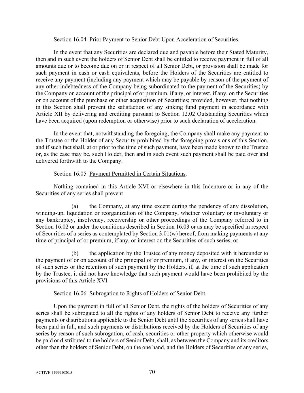 ACTIVE 119991020.5 70 Section 16.04 Prior Payment to Senior Debt Upon Acceleration of Securities. In the event that any Securities are declared due and payable before their Stated Maturity, then and in such event the holders of Senior Debt shall be entitled to receive payment in full of all amounts due or to become due on or in respect of all Senior Debt, or provision shall be made for such payment in cash or cash equivalents, before the Holders of the Securities are entitled to receive any payment (including any payment which may be payable by reason of the payment of any other indebtedness of the Company being subordinated to the payment of the Securities) by the Company on account of the principal of or premium, if any, or interest, if any, on the Securities or on account of the purchase or other acquisition of Securities; provided, however, that nothing in this Section shall prevent the satisfaction of any sinking fund payment in accordance with Article XII by delivering and crediting pursuant to Section 12.02 Outstanding Securities which have been acquired (upon redemption or otherwise) prior to such declaration of acceleration. In the event that, notwithstanding the foregoing, the Company shall make any payment to the Trustee or the Holder of any Security prohibited by the foregoing provisions of this Section, and if such fact shall, at or prior to the time of such payment, have been made known to the Trustee or, as the case may be, such Holder, then and in such event such payment shall be paid over and delivered forthwith to the Company. Section 16.05 Payment Permitted in Certain Situations. Nothing contained in this Article XVI or elsewhere in this Indenture or in any of the Securities of any series shall prevent (a) the Company, at any time except during the pendency of any dissolution, winding-up, liquidation or reorganization of the Company, whether voluntary or involuntary or any bankruptcy, insolvency, receivership or other proceedings of the Company referred to in Section 16.02 or under the conditions described in Section 16.03 or as may be specified in respect of Securities of a series as contemplated by Section 3.01(w) hereof, from making payments at any time of principal of or premium, if any, or interest on the Securities of such series, or (b) the application by the Trustee of any money deposited with it hereunder to the payment of or on account of the principal of or premium, if any, or interest on the Securities of such series or the retention of such payment by the Holders, if, at the time of such application by the Trustee, it did not have knowledge that such payment would have been prohibited by the provisions of this Article XVI. Section 16.06 Subrogation to Rights of Holders of Senior Debt. Upon the payment in full of all Senior Debt, the rights of the holders of Securities of any series shall be subrogated to all the rights of any holders of Senior Debt to receive any further payments or distributions applicable to the Senior Debt until the Securities of any series shall have been paid in full, and such payments or distributions received by the Holders of Securities of any series by reason of such subrogation, of cash, securities or other property which otherwise would be paid or distributed to the holders of Senior Debt, shall, as between the Company and its creditors other than the holders of Senior Debt, on the one hand, and the Holders of Securities of any series,