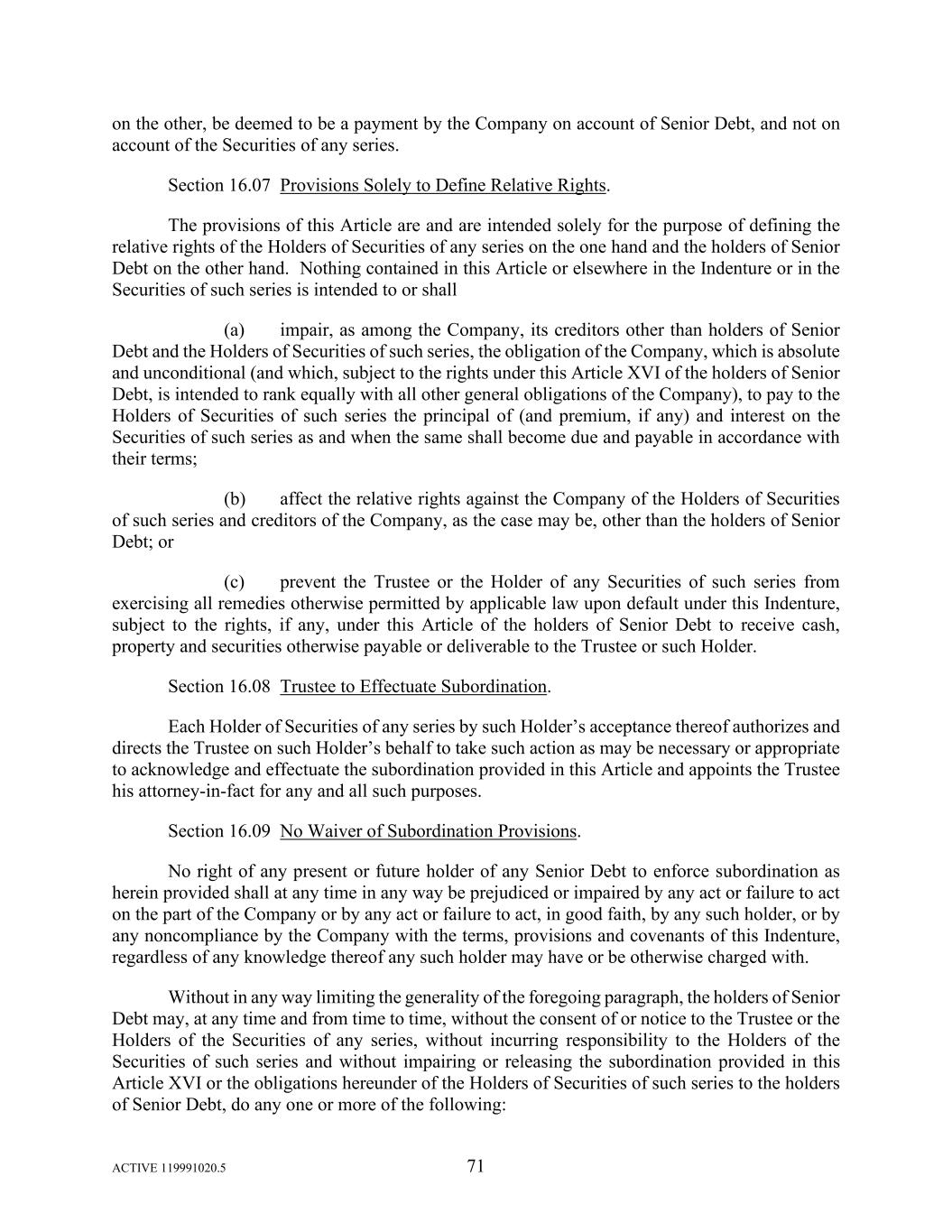 ACTIVE 119991020.5 71 on the other, be deemed to be a payment by the Company on account of Senior Debt, and not on account of the Securities of any series. Section 16.07 Provisions Solely to Define Relative Rights. The provisions of this Article are and are intended solely for the purpose of defining the relative rights of the Holders of Securities of any series on the one hand and the holders of Senior Debt on the other hand. Nothing contained in this Article or elsewhere in the Indenture or in the Securities of such series is intended to or shall (a) impair, as among the Company, its creditors other than holders of Senior Debt and the Holders of Securities of such series, the obligation of the Company, which is absolute and unconditional (and which, subject to the rights under this Article XVI of the holders of Senior Debt, is intended to rank equally with all other general obligations of the Company), to pay to the Holders of Securities of such series the principal of (and premium, if any) and interest on the Securities of such series as and when the same shall become due and payable in accordance with their terms; (b) affect the relative rights against the Company of the Holders of Securities of such series and creditors of the Company, as the case may be, other than the holders of Senior Debt; or (c) prevent the Trustee or the Holder of any Securities of such series from exercising all remedies otherwise permitted by applicable law upon default under this Indenture, subject to the rights, if any, under this Article of the holders of Senior Debt to receive cash, property and securities otherwise payable or deliverable to the Trustee or such Holder. Section 16.08 Trustee to Effectuate Subordination. Each Holder of Securities of any series by such Holder’s acceptance thereof authorizes and directs the Trustee on such Holder’s behalf to take such action as may be necessary or appropriate to acknowledge and effectuate the subordination provided in this Article and appoints the Trustee his attorney-in-fact for any and all such purposes. Section 16.09 No Waiver of Subordination Provisions. No right of any present or future holder of any Senior Debt to enforce subordination as herein provided shall at any time in any way be prejudiced or impaired by any act or failure to act on the part of the Company or by any act or failure to act, in good faith, by any such holder, or by any noncompliance by the Company with the terms, provisions and covenants of this Indenture, regardless of any knowledge thereof any such holder may have or be otherwise charged with. Without in any way limiting the generality of the foregoing paragraph, the holders of Senior Debt may, at any time and from time to time, without the consent of or notice to the Trustee or the Holders of the Securities of any series, without incurring responsibility to the Holders of the Securities of such series and without impairing or releasing the subordination provided in this Article XVI or the obligations hereunder of the Holders of Securities of such series to the holders of Senior Debt, do any one or more of the following: