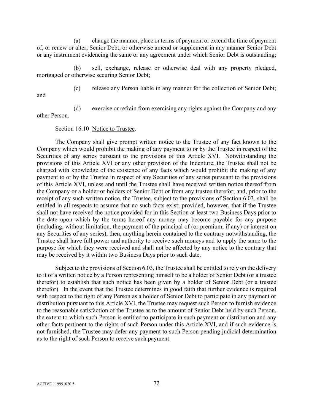 ACTIVE 119991020.5 72 (a) change the manner, place or terms of payment or extend the time of payment of, or renew or alter, Senior Debt, or otherwise amend or supplement in any manner Senior Debt or any instrument evidencing the same or any agreement under which Senior Debt is outstanding; (b) sell, exchange, release or otherwise deal with any property pledged, mortgaged or otherwise securing Senior Debt; (c) release any Person liable in any manner for the collection of Senior Debt; and (d) exercise or refrain from exercising any rights against the Company and any other Person. Section 16.10 Notice to Trustee. The Company shall give prompt written notice to the Trustee of any fact known to the Company which would prohibit the making of any payment to or by the Trustee in respect of the Securities of any series pursuant to the provisions of this Article XVI. Notwithstanding the provisions of this Article XVI or any other provision of the Indenture, the Trustee shall not be charged with knowledge of the existence of any facts which would prohibit the making of any payment to or by the Trustee in respect of any Securities of any series pursuant to the provisions of this Article XVI, unless and until the Trustee shall have received written notice thereof from the Company or a holder or holders of Senior Debt or from any trustee therefor; and, prior to the receipt of any such written notice, the Trustee, subject to the provisions of Section 6.03, shall be entitled in all respects to assume that no such facts exist; provided, however, that if the Trustee shall not have received the notice provided for in this Section at least two Business Days prior to the date upon which by the terms hereof any money may become payable for any purpose (including, without limitation, the payment of the principal of (or premium, if any) or interest on any Securities of any series), then, anything herein contained to the contrary notwithstanding, the Trustee shall have full power and authority to receive such moneys and to apply the same to the purpose for which they were received and shall not be affected by any notice to the contrary that may be received by it within two Business Days prior to such date. Subject to the provisions of Section 6.03, the Trustee shall be entitled to rely on the delivery to it of a written notice by a Person representing himself to be a holder of Senior Debt (or a trustee therefor) to establish that such notice has been given by a holder of Senior Debt (or a trustee therefor). In the event that the Trustee determines in good faith that further evidence is required with respect to the right of any Person as a holder of Senior Debt to participate in any payment or distribution pursuant to this Article XVI, the Trustee may request such Person to furnish evidence to the reasonable satisfaction of the Trustee as to the amount of Senior Debt held by such Person, the extent to which such Person is entitled to participate in such payment or distribution and any other facts pertinent to the rights of such Person under this Article XVI, and if such evidence is not furnished, the Trustee may defer any payment to such Person pending judicial determination as to the right of such Person to receive such payment.