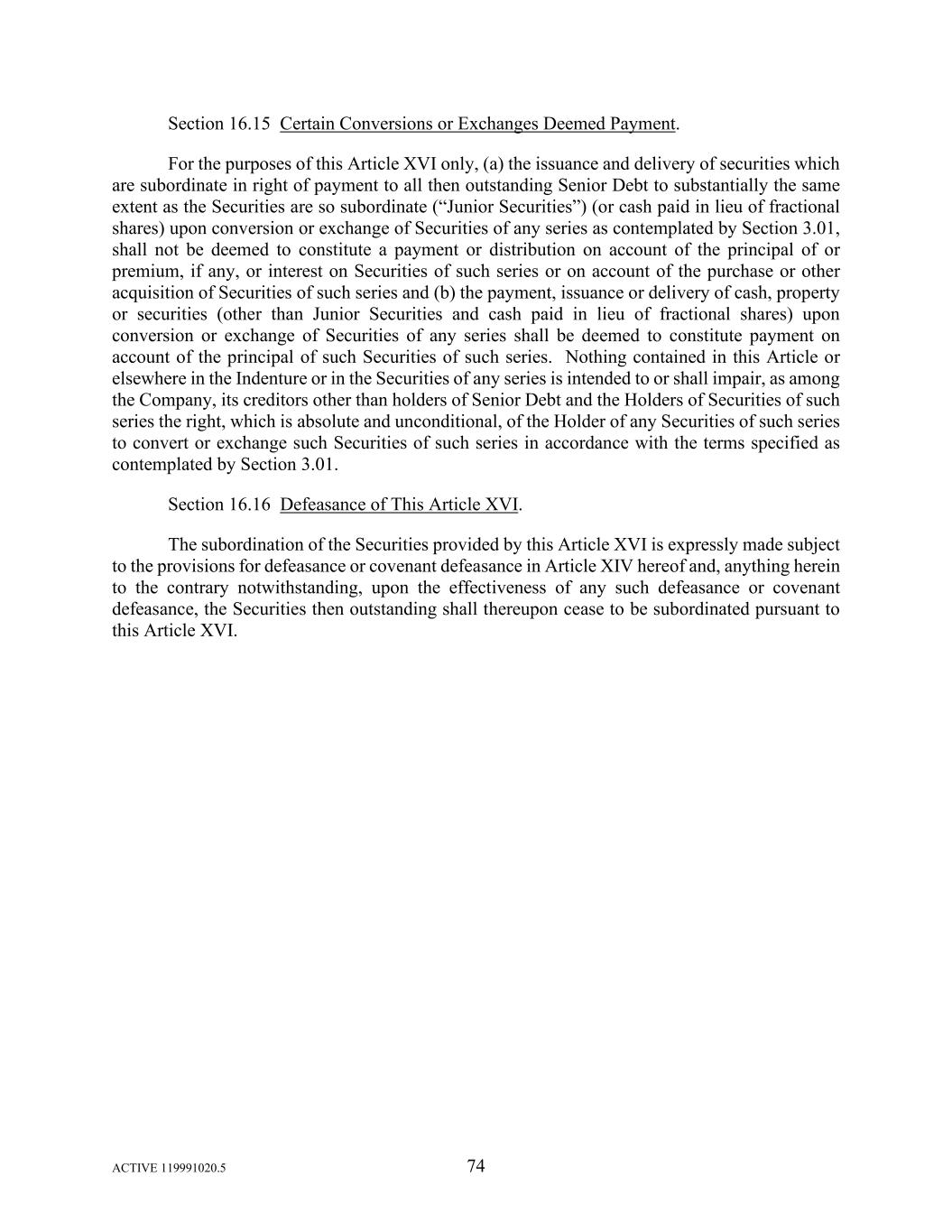 ACTIVE 119991020.5 74 Section 16.15 Certain Conversions or Exchanges Deemed Payment. For the purposes of this Article XVI only, (a) the issuance and delivery of securities which are subordinate in right of payment to all then outstanding Senior Debt to substantially the same extent as the Securities are so subordinate (“Junior Securities”) (or cash paid in lieu of fractional shares) upon conversion or exchange of Securities of any series as contemplated by Section 3.01, shall not be deemed to constitute a payment or distribution on account of the principal of or premium, if any, or interest on Securities of such series or on account of the purchase or other acquisition of Securities of such series and (b) the payment, issuance or delivery of cash, property or securities (other than Junior Securities and cash paid in lieu of fractional shares) upon conversion or exchange of Securities of any series shall be deemed to constitute payment on account of the principal of such Securities of such series. Nothing contained in this Article or elsewhere in the Indenture or in the Securities of any series is intended to or shall impair, as among the Company, its creditors other than holders of Senior Debt and the Holders of Securities of such series the right, which is absolute and unconditional, of the Holder of any Securities of such series to convert or exchange such Securities of such series in accordance with the terms specified as contemplated by Section 3.01. Section 16.16 Defeasance of This Article XVI. The subordination of the Securities provided by this Article XVI is expressly made subject to the provisions for defeasance or covenant defeasance in Article XIV hereof and, anything herein to the contrary notwithstanding, upon the effectiveness of any such defeasance or covenant defeasance, the Securities then outstanding shall thereupon cease to be subordinated pursuant to this Article XVI.