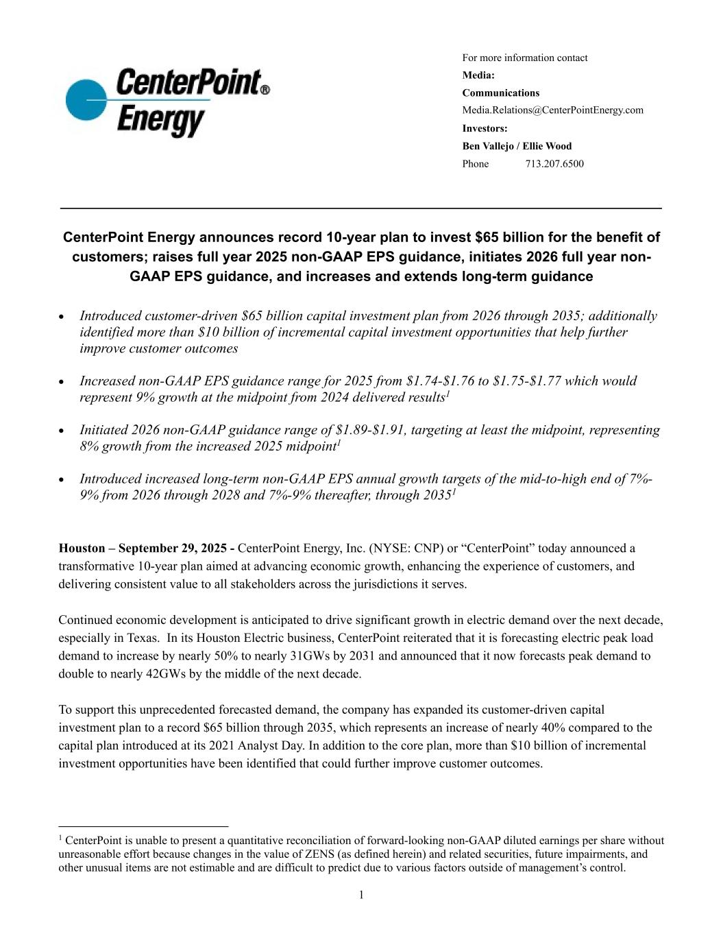 1 CenterPoint Energy announces record 10-year plan to invest $65 billion for the benefit of customers; raises full year 2025 non-GAAP EPS guidance, initiates 2026 full year non- GAAP EPS guidance, and increases and extends long-term guidance • Introduced customer-driven $65 billion capital investment plan from 2026 through 2035; additionally identified more than $10 billion of incremental capital investment opportunities that help further improve customer outcomes • Increased non-GAAP EPS guidance range for 2025 from $1.74-$1.76 to $1.75-$1.77 which would represent 9% growth at the midpoint from 2024 delivered results1 • Initiated 2026 non-GAAP guidance range of $1.89-$1.91, targeting at least the midpoint, representing 8% growth from the increased 2025 midpoint1 • Introduced increased long-term non-GAAP EPS annual growth targets of the mid-to-high end of 7%- 9% from 2026 through 2028 and 7%-9% thereafter, through 20351 Houston – September 29, 2025 - CenterPoint Energy, Inc. (NYSE: CNP) or “CenterPoint” today announced a transformative 10-year plan aimed at advancing economic growth, enhancing the experience of customers, and delivering consistent value to all stakeholders across the jurisdictions it serves. Continued economic development is anticipated to drive significant growth in electric demand over the next decade, especially in Texas. In its Houston Electric business, CenterPoint reiterated that it is forecasting electric peak load demand to increase by nearly 50% to nearly 31GWs by 2031 and announced that it now forecasts peak demand to double to nearly 42GWs by the middle of the next decade. To support this unprecedented forecasted demand, the company has expanded its customer-driven capital investment plan to a record $65 billion through 2035, which represents an increase of nearly 40% compared to the capital plan introduced at its 2021 Analyst Day. In addition to the core plan, more than $10 billion of incremental investment opportunities have been identified that could further improve customer outcomes. 1 CenterPoint is unable to present a quantitative reconciliation of forward-looking non-GAAP diluted earnings per share without unreasonable effort because changes in the value of ZENS (as defined herein) and related securities, future impairments, and other unusual items are not estimable and are difficult to predict due to various factors outside of management’s control. For more information contact Media: Communications Media.Relations@CenterPointEnergy.com Investors: Ben Vallejo / Ellie Wood Phone 713.207.6500