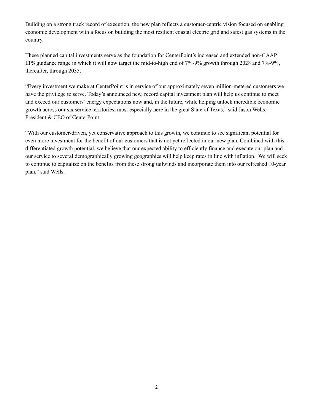 2 Building on a strong track record of execution, the new plan reflects a customer-centric vision focused on enabling economic development with a focus on building the most resilient coastal electric grid and safest gas systems in the country. These planned capital investments serve as the foundation for CenterPoint’s increased and extended non-GAAP EPS guidance range in which it will now target the mid-to-high end of 7%-9% growth through 2028 and 7%-9%, thereafter, through 2035. “Every investment we make at CenterPoint is in service of our approximately seven million-metered customers we have the privilege to serve. Today’s announced new, record capital investment plan will help us continue to meet and exceed our customers’ energy expectations now and, in the future, while helping unlock incredible economic growth across our six service territories, most especially here in the great State of Texas,” said Jason Wells, President & CEO of CenterPoint. “With our customer-driven, yet conservative approach to this growth, we continue to see significant potential for even more investment for the benefit of our customers that is not yet reflected in our new plan. Combined with this differentiated growth potential, we believe that our expected ability to efficiently finance and execute our plan and our service to several demographically growing geographies will help keep rates in line with inflation. We will seek to continue to capitalize on the benefits from these strong tailwinds and incorporate them into our refreshed 10-year plan,” said Wells.