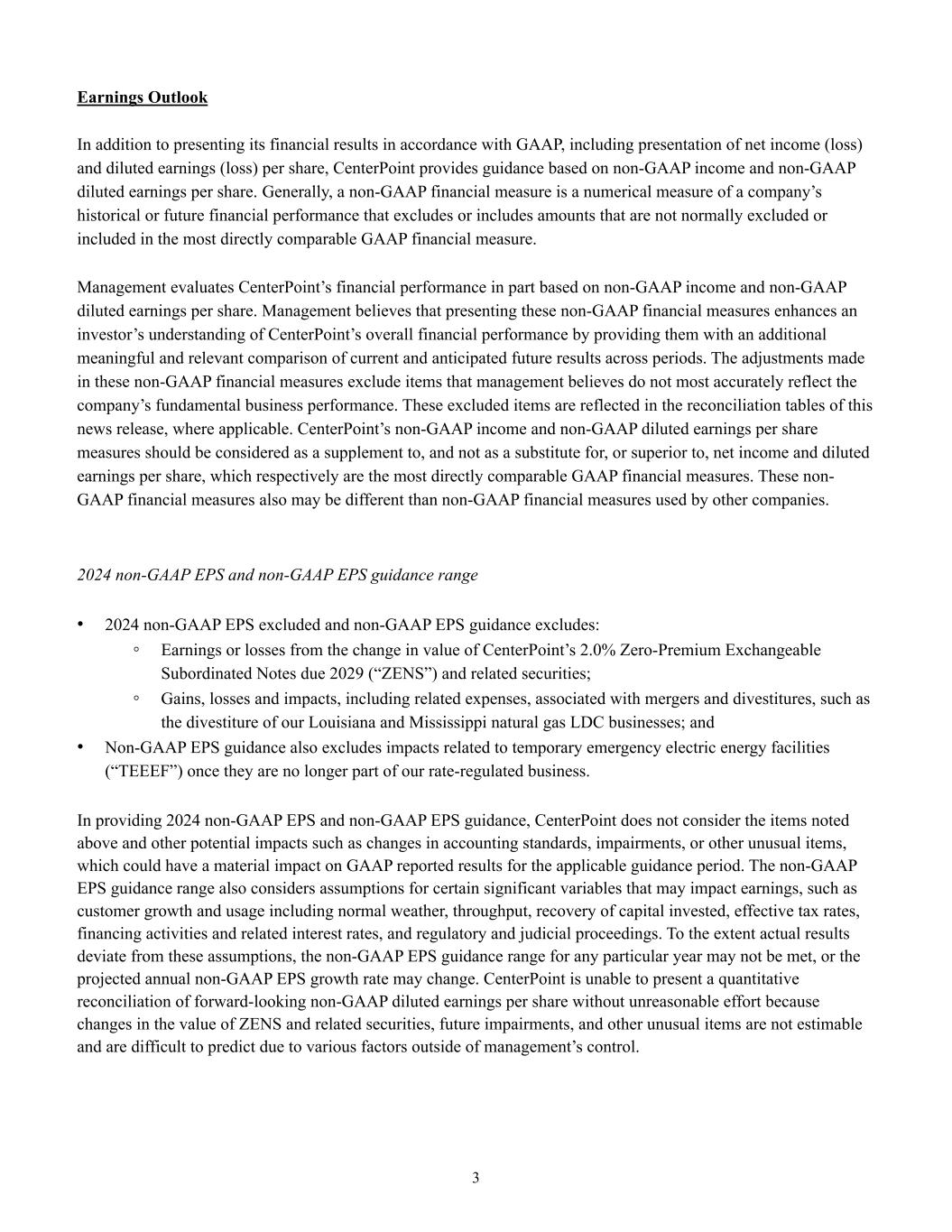 3 Earnings Outlook In addition to presenting its financial results in accordance with GAAP, including presentation of net income (loss) and diluted earnings (loss) per share, CenterPoint provides guidance based on non-GAAP income and non-GAAP diluted earnings per share. Generally, a non-GAAP financial measure is a numerical measure of a company’s historical or future financial performance that excludes or includes amounts that are not normally excluded or included in the most directly comparable GAAP financial measure. Management evaluates CenterPoint’s financial performance in part based on non-GAAP income and non-GAAP diluted earnings per share. Management believes that presenting these non-GAAP financial measures enhances an investor’s understanding of CenterPoint’s overall financial performance by providing them with an additional meaningful and relevant comparison of current and anticipated future results across periods. The adjustments made in these non-GAAP financial measures exclude items that management believes do not most accurately reflect the company’s fundamental business performance. These excluded items are reflected in the reconciliation tables of this news release, where applicable. CenterPoint’s non-GAAP income and non-GAAP diluted earnings per share measures should be considered as a supplement to, and not as a substitute for, or superior to, net income and diluted earnings per share, which respectively are the most directly comparable GAAP financial measures. These non- GAAP financial measures also may be different than non-GAAP financial measures used by other companies. 2024 non-GAAP EPS and non-GAAP EPS guidance range • 2024 non-GAAP EPS excluded and non-GAAP EPS guidance excludes: ◦ Earnings or losses from the change in value of CenterPoint’s 2.0% Zero-Premium Exchangeable Subordinated Notes due 2029 (“ZENS”) and related securities; ◦ Gains, losses and impacts, including related expenses, associated with mergers and divestitures, such as the divestiture of our Louisiana and Mississippi natural gas LDC businesses; and • Non-GAAP EPS guidance also excludes impacts related to temporary emergency electric energy facilities (“TEEEF”) once they are no longer part of our rate-regulated business. In providing 2024 non-GAAP EPS and non-GAAP EPS guidance, CenterPoint does not consider the items noted above and other potential impacts such as changes in accounting standards, impairments, or other unusual items, which could have a material impact on GAAP reported results for the applicable guidance period. The non-GAAP EPS guidance range also considers assumptions for certain significant variables that may impact earnings, such as customer growth and usage including normal weather, throughput, recovery of capital invested, effective tax rates, financing activities and related interest rates, and regulatory and judicial proceedings. To the extent actual results deviate from these assumptions, the non-GAAP EPS guidance range for any particular year may not be met, or the projected annual non-GAAP EPS growth rate may change. CenterPoint is unable to present a quantitative reconciliation of forward-looking non-GAAP diluted earnings per share without unreasonable effort because changes in the value of ZENS and related securities, future impairments, and other unusual items are not estimable and are difficult to predict due to various factors outside of management’s control.