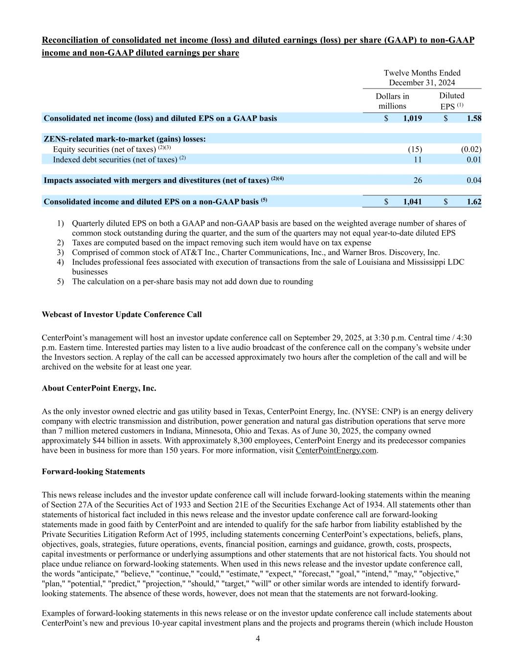 4 Reconciliation of consolidated net income (loss) and diluted earnings (loss) per share (GAAP) to non-GAAP income and non-GAAP diluted earnings per share Twelve Months Ended December 31, 2024 Dollars in millions Diluted EPS (1) Consolidated net income (loss) and diluted EPS on a GAAP basis $ 1,019 $ 1.58 ZENS-related mark-to-market (gains) losses: Equity securities (net of taxes) (2)(3) (15) (0.02) Indexed debt securities (net of taxes) (2) 11 0.01 Impacts associated with mergers and divestitures (net of taxes) (2)(4) 26 0.04 Consolidated income and diluted EPS on a non-GAAP basis (5) $ 1,041 $ 1.62 1) Quarterly diluted EPS on both a GAAP and non-GAAP basis are based on the weighted average number of shares of common stock outstanding during the quarter, and the sum of the quarters may not equal year-to-date diluted EPS 2) Taxes are computed based on the impact removing such item would have on tax expense 3) Comprised of common stock of AT&T Inc., Charter Communications, Inc., and Warner Bros. Discovery, Inc. 4) Includes professional fees associated with execution of transactions from the sale of Louisiana and Mississippi LDC businesses 5) The calculation on a per-share basis may not add down due to rounding Webcast of Investor Update Conference Call CenterPoint’s management will host an investor update conference call on September 29, 2025, at 3:30 p.m. Central time / 4:30 p.m. Eastern time. Interested parties may listen to a live audio broadcast of the conference call on the company’s website under the Investors section. A replay of the call can be accessed approximately two hours after the completion of the call and will be archived on the website for at least one year. About CenterPoint Energy, Inc. As the only investor owned electric and gas utility based in Texas, CenterPoint Energy, Inc. (NYSE: CNP) is an energy delivery company with electric transmission and distribution, power generation and natural gas distribution operations that serve more than 7 million metered customers in Indiana, Minnesota, Ohio and Texas. As of June 30, 2025, the company owned approximately $44 billion in assets. With approximately 8,300 employees, CenterPoint Energy and its predecessor companies have been in business for more than 150 years. For more information, visit CenterPointEnergy.com. Forward-looking Statements This news release includes and the investor update conference call will include forward-looking statements within the meaning of Section 27A of the Securities Act of 1933 and Section 21E of the Securities Exchange Act of 1934. All statements other than statements of historical fact included in this news release and the investor update conference call are forward-looking statements made in good faith by CenterPoint and are intended to qualify for the safe harbor from liability established by the Private Securities Litigation Reform Act of 1995, including statements concerning CenterPoint’s expectations, beliefs, plans, objectives, goals, strategies, future operations, events, financial position, earnings and guidance, growth, costs, prospects, capital investments or performance or underlying assumptions and other statements that are not historical facts. You should not place undue reliance on forward-looking statements. When used in this news release and the investor update conference call, the words "anticipate," "believe," "continue," "could," "estimate," "expect," "forecast," "goal," "intend," "may," "objective," "plan," "potential," "predict," "projection," "should," "target," "will" or other similar words are intended to identify forward- looking statements. The absence of these words, however, does not mean that the statements are not forward-looking. Examples of forward-looking statements in this news release or on the investor update conference call include statements about CenterPoint’s new and previous 10-year capital investment plans and the projects and programs therein (which include Houston