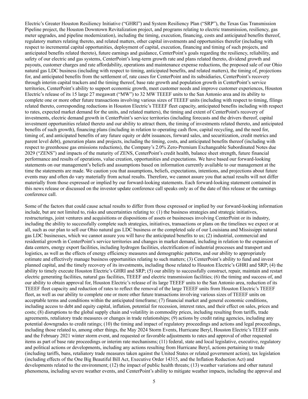 5 Electric’s Greater Houston Resiliency Initiative (“GHRI”) and System Resiliency Plan (“SRP”), the Texas Gas Transmission Pipeline project, the Houston Downtown Revitalization project, and programs relating to electric transmission, resiliency, gas meter upgrades, and pipeline modernization), including the timing, execution, financing, costs and anticipated benefits thereof, regulatory matters relating thereto, and related matters, other capital investments and opportunities therefor (including with respect to incremental capital opportunities, deployment of capital, execution, financing and timing of such projects, and anticipated benefits related thereto), future earnings and guidance, CenterPoint’s goals regarding the resiliency, reliability, and safety of our electric and gas systems, CenterPoint’s long-term growth rate and plans related thereto, dividend growth and payouts, customer charges and rate affordability, operations and maintenance expense reductions, the proposed sale of our Ohio natural gas LDC business (including with respect to timing, anticipated benefits, and related matters), the timing of, projections for, and anticipated benefits from the settlement of, rate cases for CenterPoint and its subsidiaries, CenterPoint’s recovery through interim capital trackers and the timing thereof, base rate growth and population growth in CenterPoint’s service territories, CenterPoint’s ability to support economic growth, meet customer needs and improve customer experiences, Houston Electric’s release of its 15 large 27 megawatt (“MW”) to 32 MW TEEEF units to the San Antonio area and its ability to complete one or more other future transactions involving various sizes of TEEEF units (including with respect to timing, filings related thereto, corresponding reductions in Houston Electric’s TEEEF fleet capacity, anticipated benefits including with respect to rates, expected market demand for the units, and related matters), the timing and extent of CenterPoint's recovery of investments, electric demand growth in CenterPoint’s service territories (including forecasts and the drivers thereof, capital investment opportunities related thereto and our ability to attract them, the timing of investments related thereto, and anticipated benefits of such growth), financing plans (including in relation to operating cash flow, capital recycling, and the need for, timing of, and anticipated benefits of any future equity or debt issuances, forward sales, and securitization, credit metrics and parent level debt), generation plans and projects, including the timing, costs, and anticipated benefits thereof (including with respect to greenhouse gas emissions reductions), the Company’s 2.0% Zero-Premium Exchangeable Subordinated Notes due 2029 (“ZENS”) and impacts of the maturity of ZENS, CenterPoint’s credit health, balance sheet strength, future financial performance and results of operations, value creation, opportunities and expectations. We have based our forward-looking statements on our management’s beliefs and assumptions based on information currently available to our management at the time the statements are made. We caution you that assumptions, beliefs, expectations, intentions, and projections about future events may and often do vary materially from actual results. Therefore, we cannot assure you that actual results will not differ materially from those expressed or implied by our forward-looking statements. Each forward-looking statement contained in this news release or discussed on the investor update conference call speaks only as of the date of this release or the earnings conference call. Some of the factors that could cause actual results to differ from those expressed or implied by our forward-looking information include, but are not limited to, risks and uncertainties relating to: (1) the business strategies and strategic initiatives, restructurings, joint ventures and acquisitions or dispositions of assets or businesses involving CenterPoint or its industry, including the ability to successfully complete such strategies, initiatives, transactions or plans on the timelines we expect or at all, such as our plan to sell our Ohio natural gas LDC business or the completed sale of our Louisiana and Mississippi natural gas LDC businesses, which we cannot assure you will have the anticipated benefits to us; (2) industrial, commercial and residential growth in CenterPoint’s service territories and changes in market demand, including in relation to the expansion of data centers, energy export facilities, including hydrogen facilities, electrification of industrial processes and transport and logistics, as well as the effects of energy efficiency measures and demographic patterns, and our ability to appropriately estimate and effectively manage business opportunities relating to such matters; (3) CenterPoint’s ability to fund and invest planned capital, and the timely recovery of its investments, including those related to Houston Electric’s GHRI and SRP; (4) the ability to timely execute Houston Electric’s GHRI and SRP; (5) our ability to successfully construct, repair, maintain and restart electric generating facilities, natural gas facilities, TEEEF and electric transmission facilities; (6) the timing and success of, and our ability to obtain approval for, Houston Electric’s release of its large TEEEF units to the San Antonio area, reduction of its TEEEF fleet capacity and reduction of rates to reflect the removal of the large TEEEF units from Houston Electric’s TEEEF fleet, as well as our ability to complete one or more other future transactions involving various sizes of TEEEF units on acceptable terms and conditions within the anticipated timeframe; (7) financial market and general economic conditions, including access to debt and equity capital, inflation, potential for recession, interest rates, and their effect on sales, prices a