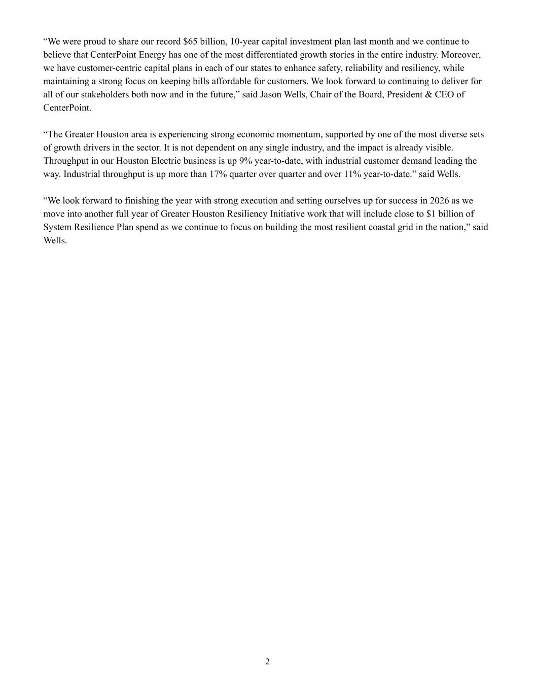 2 “We were proud to share our record $65 billion, 10-year capital investment plan last month and we continue to believe that CenterPoint Energy has one of the most differentiated growth stories in the entire industry. Moreover, we have customer-centric capital plans in each of our states to enhance safety, reliability and resiliency, while maintaining a strong focus on keeping bills affordable for customers. We look forward to continuing to deliver for all of our stakeholders both now and in the future,” said Jason Wells, Chair of the Board, President & CEO of CenterPoint. “The Greater Houston area is experiencing strong economic momentum, supported by one of the most diverse sets of growth drivers in the sector. It is not dependent on any single industry, and the impact is already visible. Throughput in our Houston Electric business is up 9% year-to-date, with industrial customer demand leading the way. Industrial throughput is up more than 17% quarter over quarter and over 11% year-to-date.” said Wells. “We look forward to finishing the year with strong execution and setting ourselves up for success in 2026 as we move into another full year of Greater Houston Resiliency Initiative work that will include close to $1 billion of System Resilience Plan spend as we continue to focus on building the most resilient coastal grid in the nation,” said Wells.